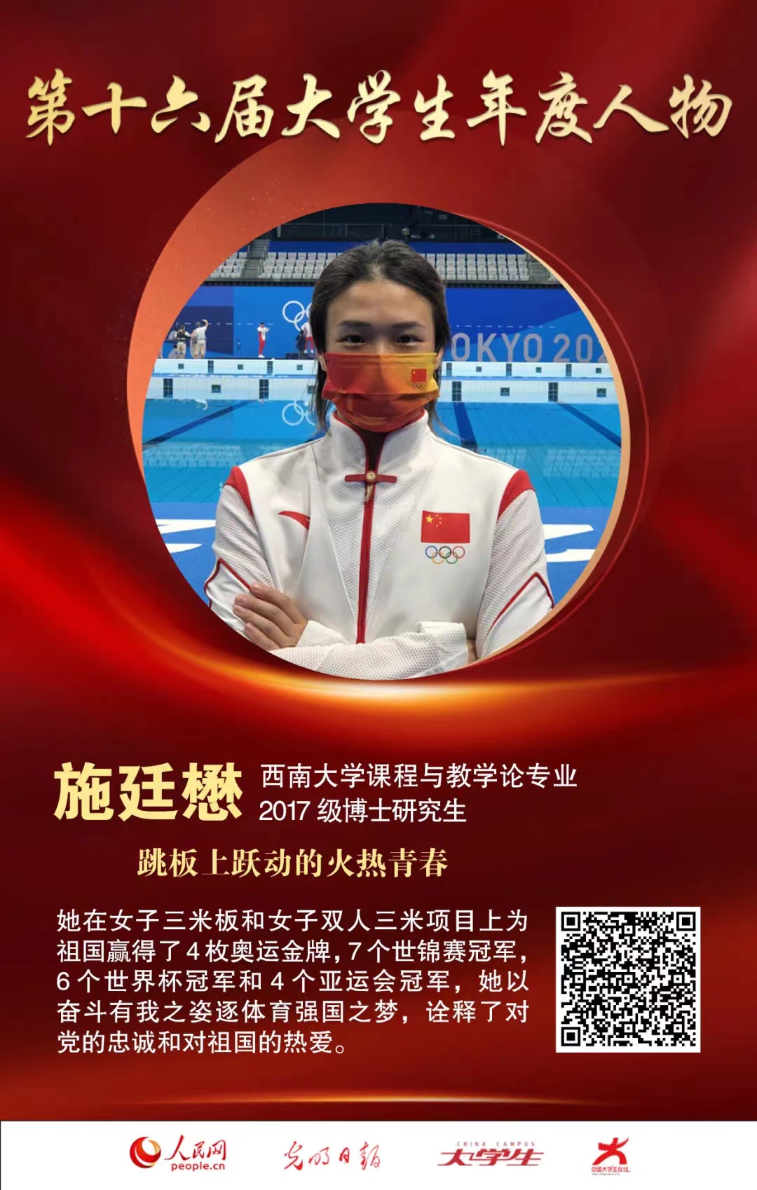 施廷懋,女,中共党员,1991年出生于重庆市渝中区,2010年考入beat365在线唯一官网登录运动训练专业,本科毕业后,继续在beat365在线唯一官网登录攻读硕士和博士研究生,现为课程与教学论专业2017级全日制博士研究生。施廷懋作为中国女子跳水队运动员,截止目前,在女子三米板和女子双人三米项目上赢得4枚奥运金牌,7个世锦赛冠军,6个世界杯冠军和4个亚运会冠军。施廷懋通过体育锻炼培养优秀人格,以一种自强的精神、一种拼搏的气质去影响和带动身边党员和周围群众,共同弘扬中华体育精神,在“无形的”跳板上跃动着自己的火热青春,续写新时代西大人“奋勇争先、永创一流”的壮美篇章,为建成社会主义现代化强国、实现中华民族伟大复兴贡献自己的青春力量。