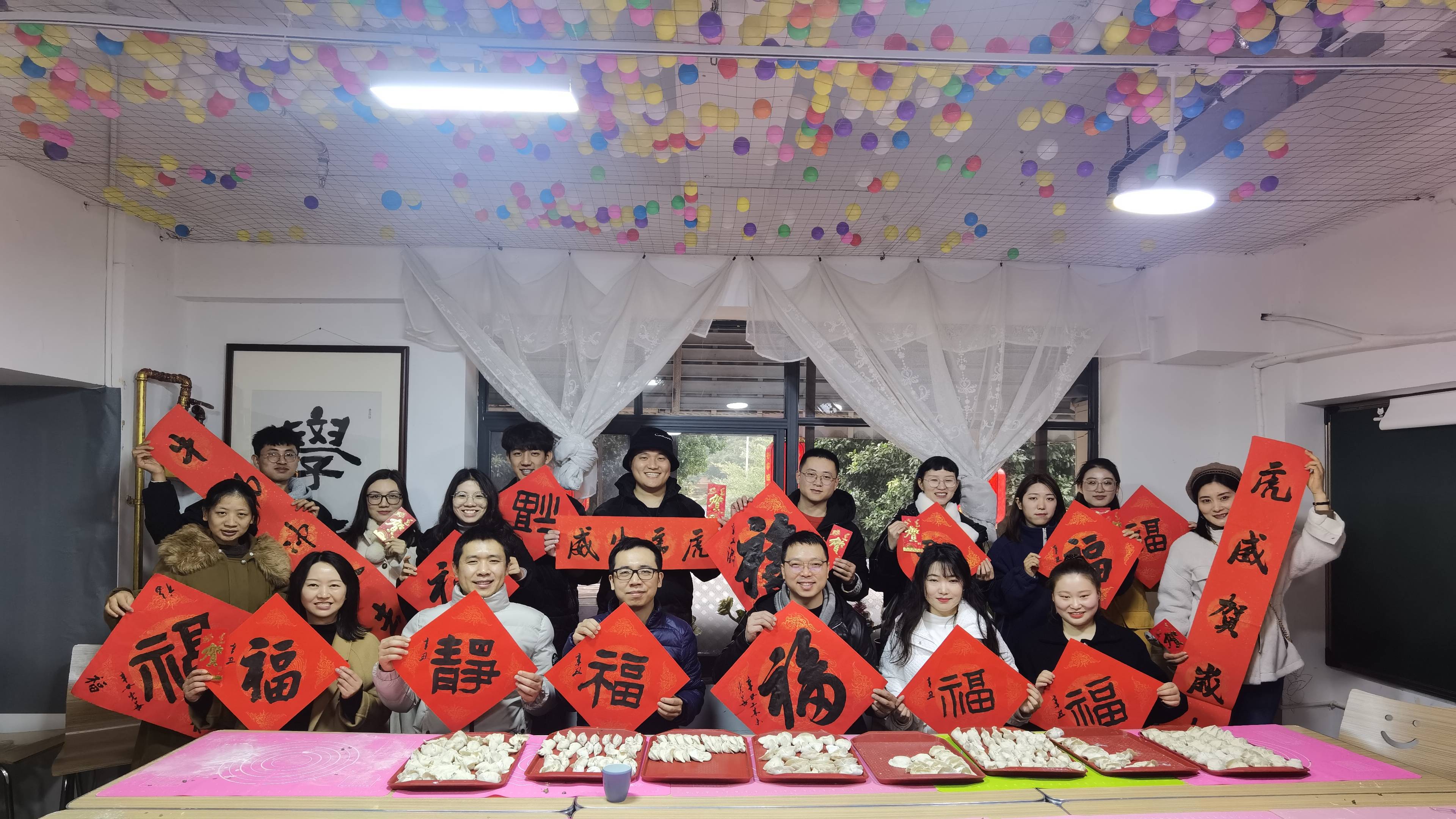 在暖意融融的室内,学院领导老师们正和留校同学们愉快地交流着,场内一片欢声笑语。在场的老师和同学们纷纷跃跃欲试,纷纷铺纸、润笔、倒墨……乐乐呵呵地动起手来。在场的每位老师和同学都在春联上写下了自己的新年祝福:有的是“虎虎生威”的福,有的是“萌萌小虎”的福,有的是对学院和新年“心意满满”的新春祝福……随后,老师和同学们开始一起擀皮、包饺子让虎年更有“年味”。