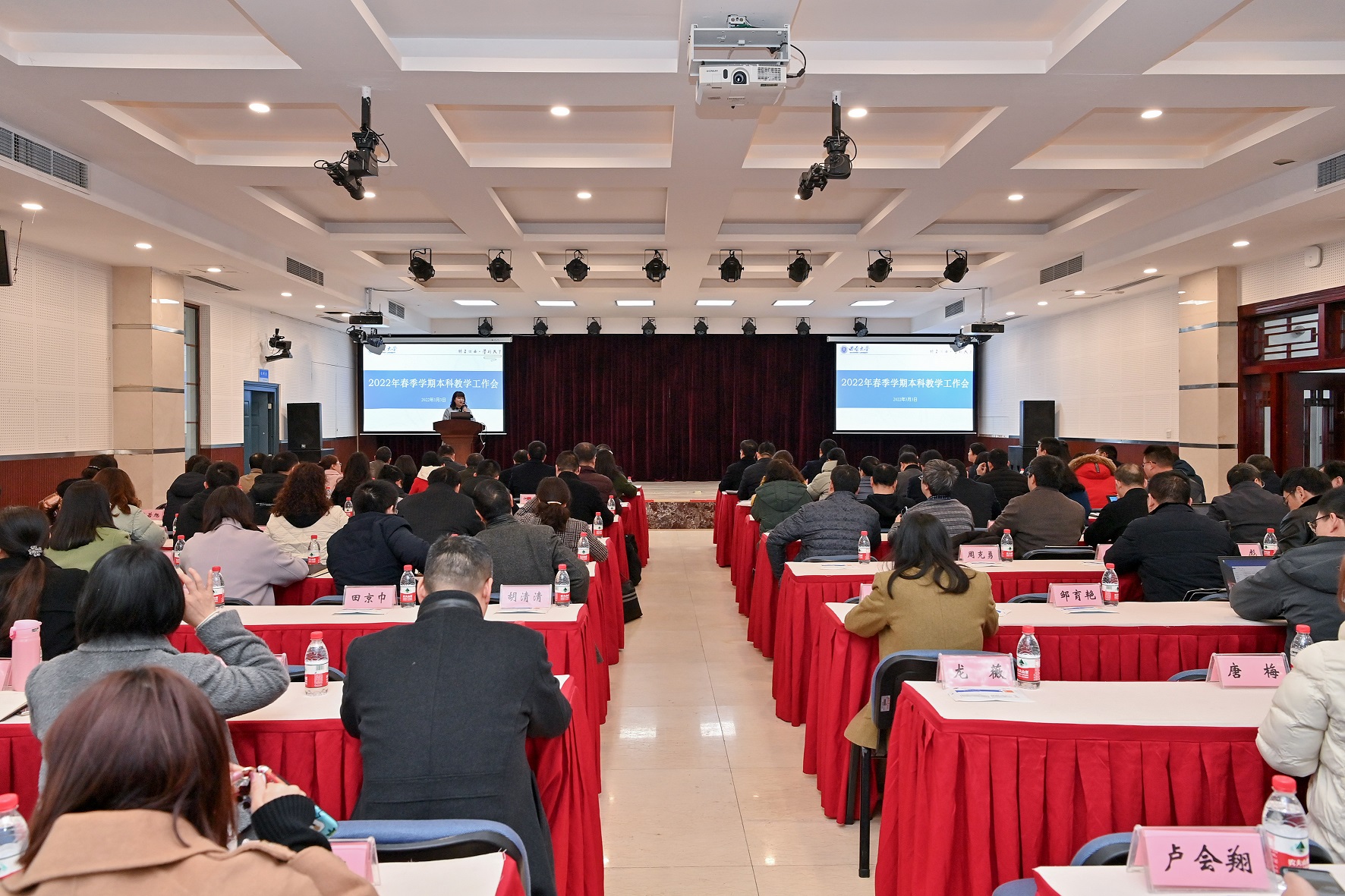 会上,教务处处长吴能表以《跳出既有圈层创新教育形态》为主题,提出2022年本科教育教学工作关键词“制度、执行、质量”,分别从时代挑战、理念思路、工作点击等方面对2022年本科教学工作作部署。教师教学发展中心主任刘义兵从完善教师教学发展的制度建设、教师教学能力发展落实、健全完善基础教学组织等方面介绍2022年教师教学发展中心重点工作。信息化建设办公室主任贾韬、创新创业学院院长张斌就数智西大“课堂签到”功能服务、做好“互联网+”创新创业大赛等工作作介绍。
