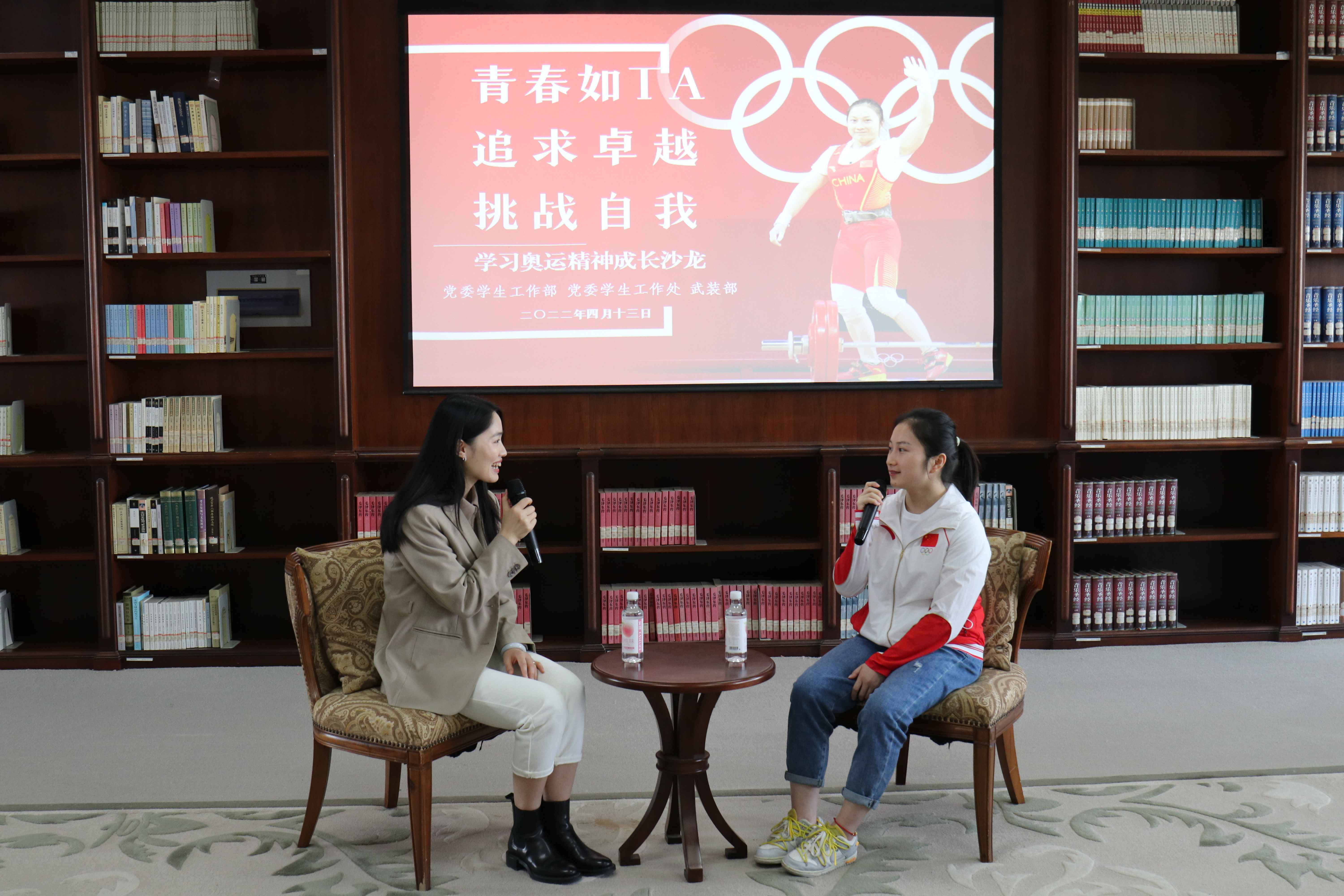 4月13日,学校“青春如TA”系列成长沙龙在学校中心图书馆9楼举行。本期沙龙主题为“追求卓越,挑战自我——与奥运健儿面对面”。体育学院2020级硕士研究生、2020年东京奥运会举重55公斤级银牌获得者廖秋云同学受邀分享了她的青春奋斗故事。