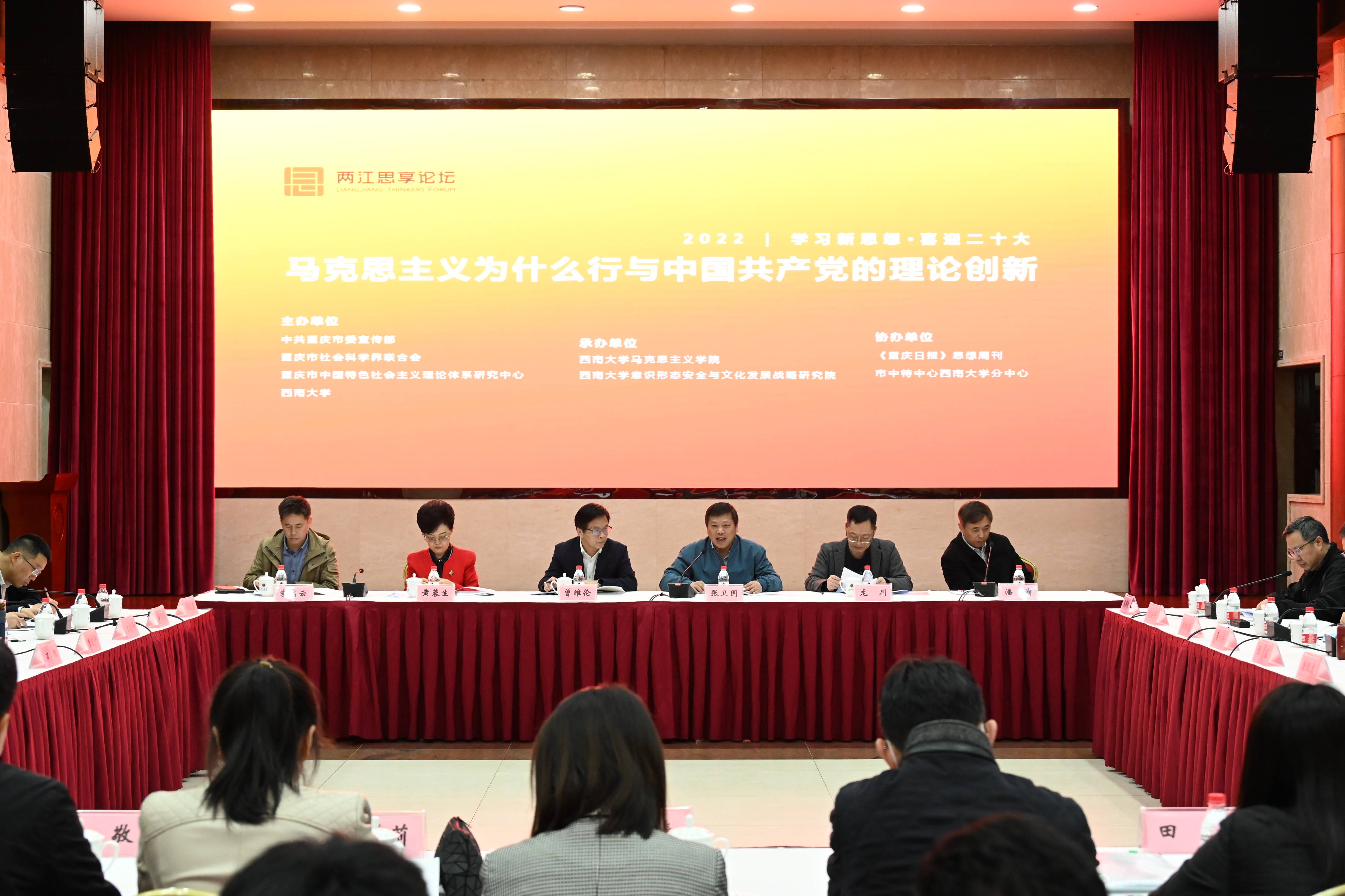 2022年4月16日,在习近平总书记视察重庆提出“能”“行”“好”重大理论命题三周年之际,为深入贯彻落实党的十九届六中全会精神,推进习近平新时代中国特色社会主义思想研究,由中共重庆市委宣传部、重庆市社会科学界联合会、重庆市中国特色社会主义理论体系研究中心、beat365在线唯一官网登录主办,beat365在线唯一官网登录马克思主义学院、beat365在线唯一官网登录意识形态安全与文化发展战略研究院承办的“两江思享论坛:学习新思想 喜迎二十大”首场会议“马克思主义为什么行与中国共产党的理论创新”学术研讨会在beat365在线唯一官网登录召开。中央“马工程”首席专家、国务院学位委员会马克思主义理论学科评议组专家、重庆市社会科学界专家学者、《重庆日报》思想周刊负责人、媒体记者以及beat365在线唯一官网登录师生代表参加研讨会。