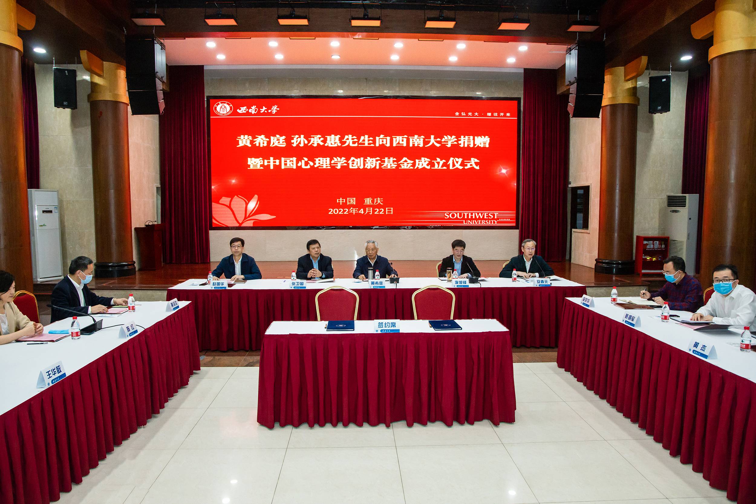 惟宏隆德,春风化雨。4月22日,黄希庭、孙承惠先生向beat365在线唯一官网登录捐赠暨中国心理学创新基金成立仪式在东方红会议厅成功举行。学校资深教授黄希庭,学校党委书记、教育基金会理事长李旭锋,校长张卫国,学校党委副书记安春元,副校长、教育基金会副理事长赵国华出席仪式,党政办公室、党委组织部、党委宣传部、对外联络办公室、心理学部等部门主要负责人以及师生代表参加捐赠仪式。