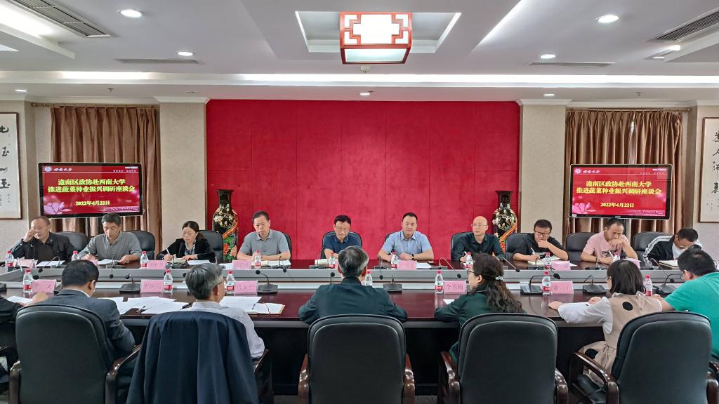 4月22日上午,潼南区政协副主席彭锐一行来校开展推进蔬菜种业振兴调研,学校党委副书记安春元出席调研座谈,党政办公室、党委统战部、园艺园林学院相关负责人陪同调研。
