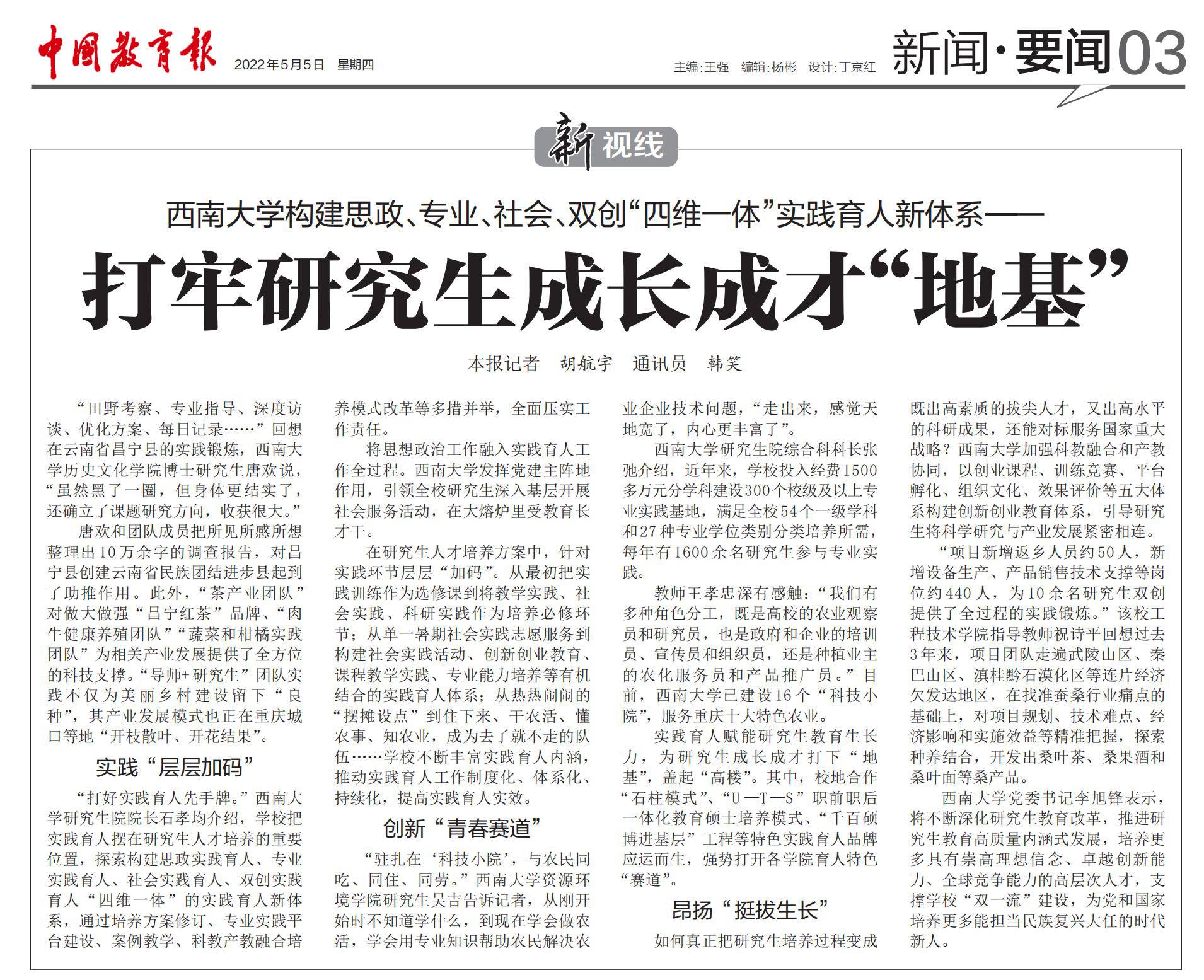 5月5日,《中国教育报》3版头条以“beat365在线唯一官网登录构建思政、专业、社会、双创“四维一体”实践育人新体系——打牢研究生成长成才‘地基’”为题报道学校研究生实践育人工作,报道原文如下:
