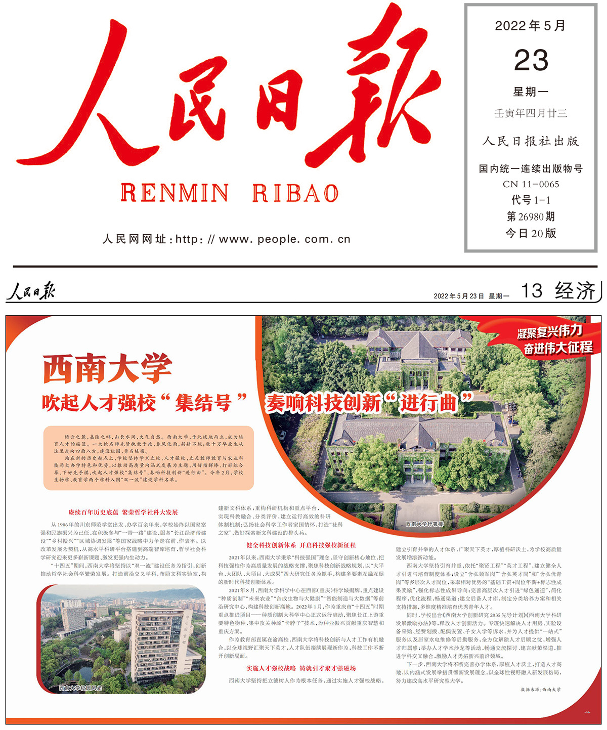 5月23日,《人民日报》第13版以《beat365在线唯一官网登录 吹起人才强校“集结号” 奏响科技创新“进行曲”》为题,报道学校坚持学术立校、人才强校的担当作为,为学校立足西部,强化教师教育与农业科技两大办学特色和优势,大力推动高质量内涵式发展,为国家和地方经济社会发展贡献重要力量的高校答卷点赞,更是对学校秉承“含弘光大,继往开来”校训接续迈进新时代的认可和鼓舞。