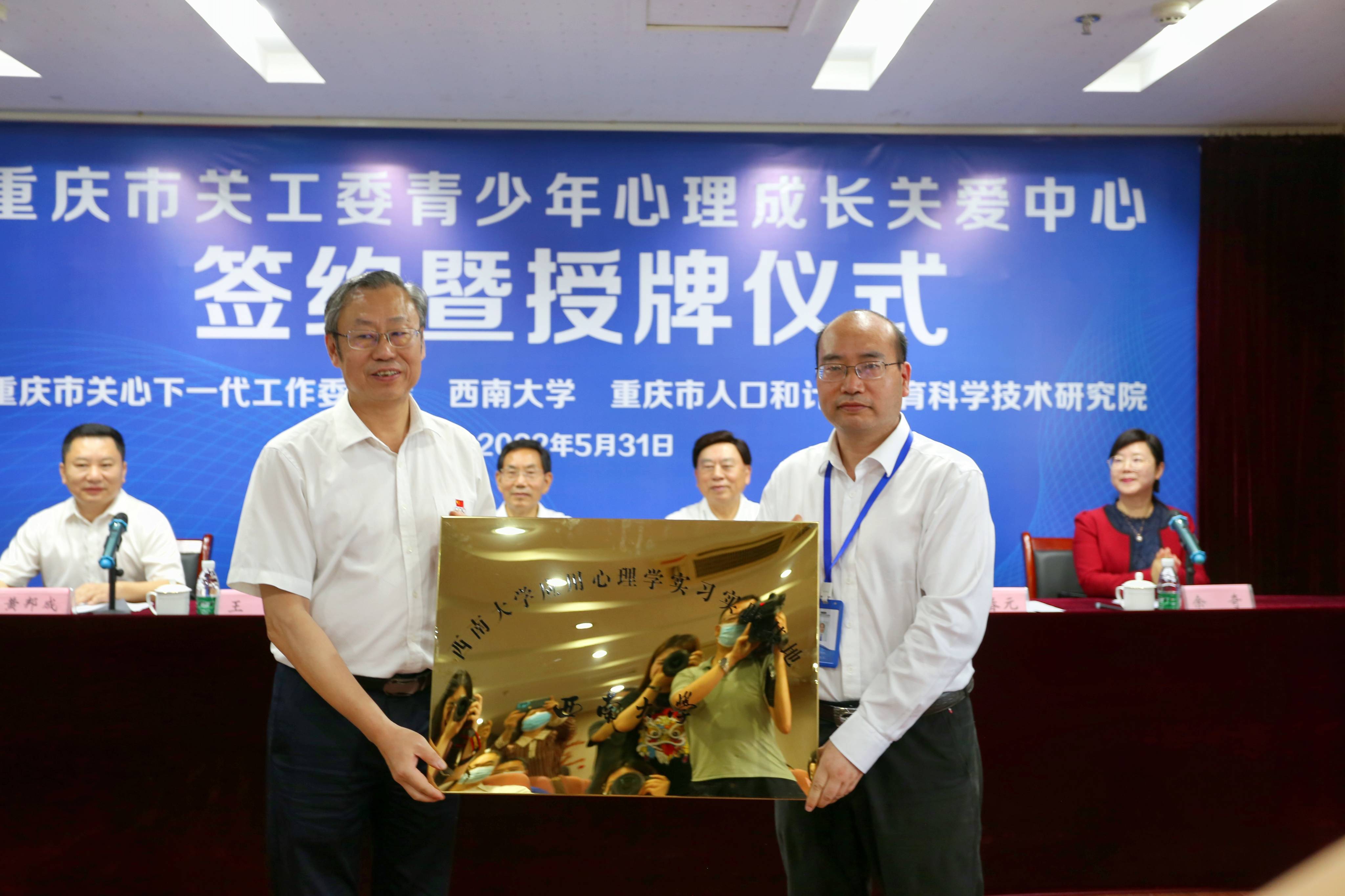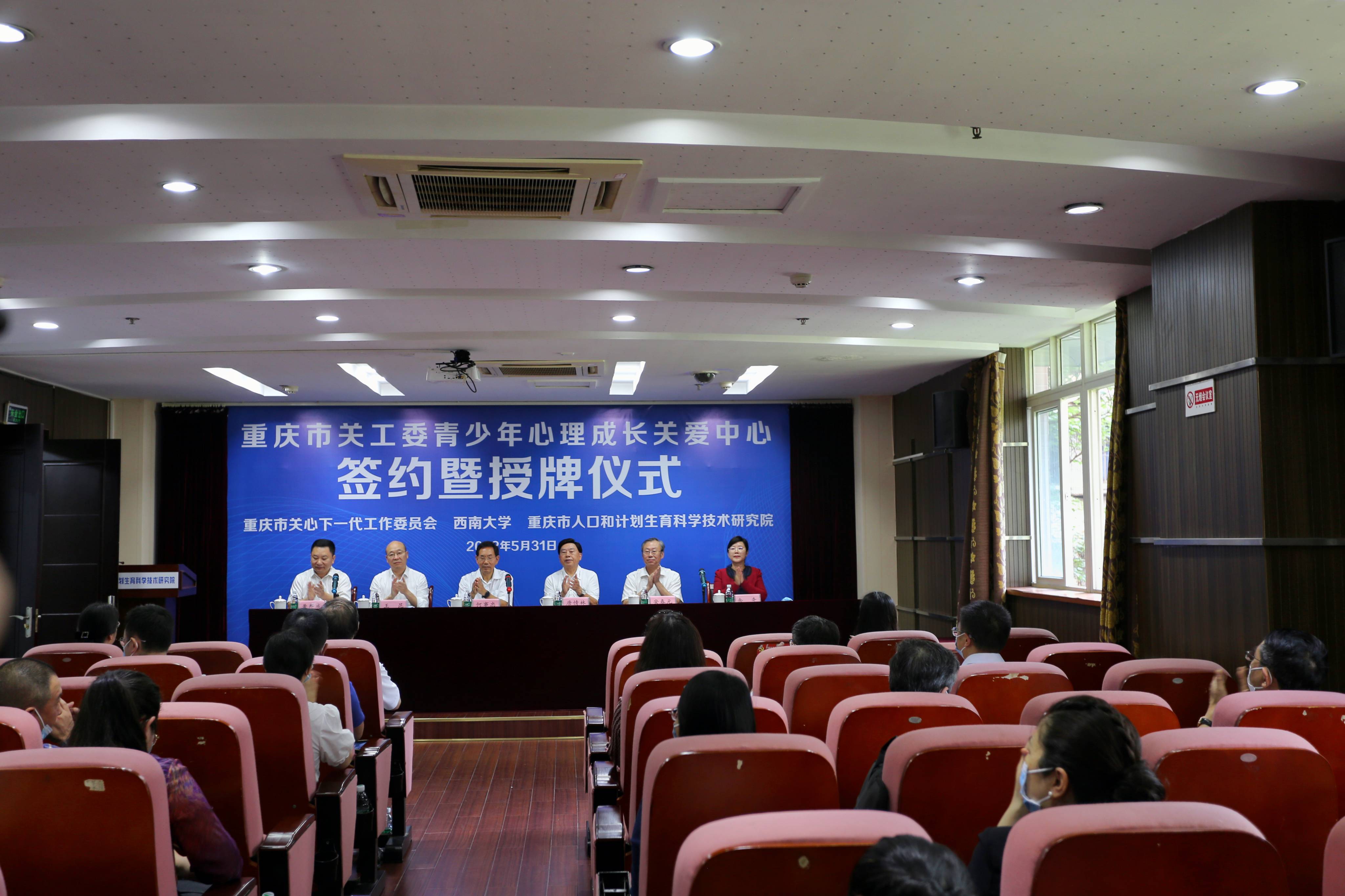 5月31日,在“六一”国际儿童节来临之际,心理学部与重庆市关工委、重庆市人口计生研究院举行“重庆市关工委青少年心理成长关爱中心” “beat365在线唯一官网登录应用心理学专业实习实践基地”签约暨授牌仪式。市关工委主任何事忠、常务副主任唐情林、副主任刘丽俐、秘书长韩国涛,市卫生健康委副主任王昆,市人口计生研究院党委书记黄邦成、院长余奇,学校党委副书记安春元出席仪式,学校国内合作处、心理学部有关领导教师参加仪式。