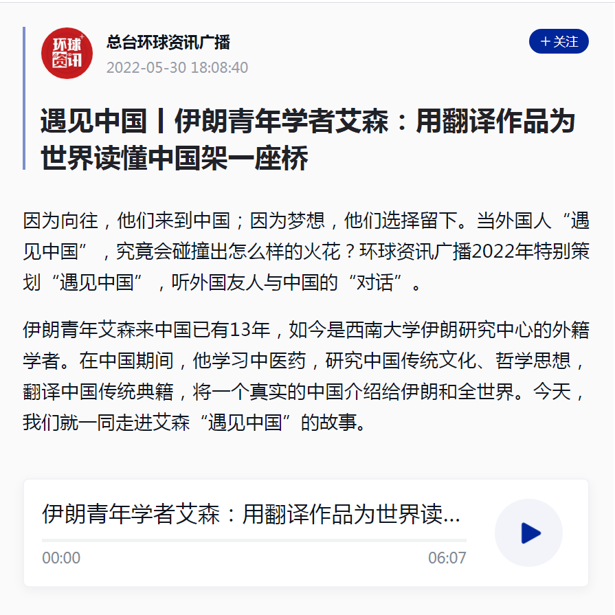 5月30日,在环球资讯广播2022年特别策划的“遇见中国”听外国友人与中国的“对话”节目中,央视新闻网国际在线采访了学校伊朗研究中心伊朗籍专家艾森·杜斯特·穆罕默迪(艾森)。