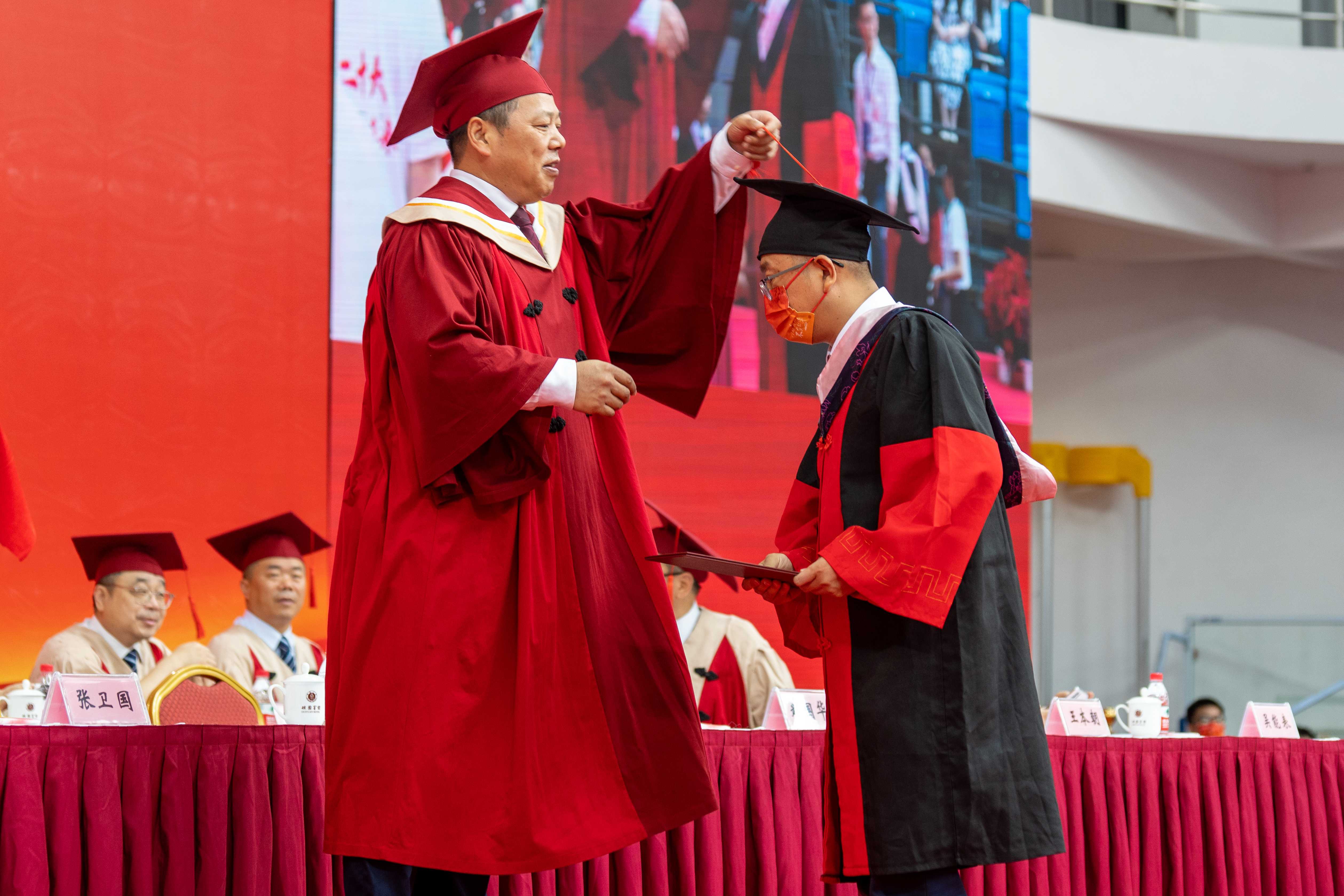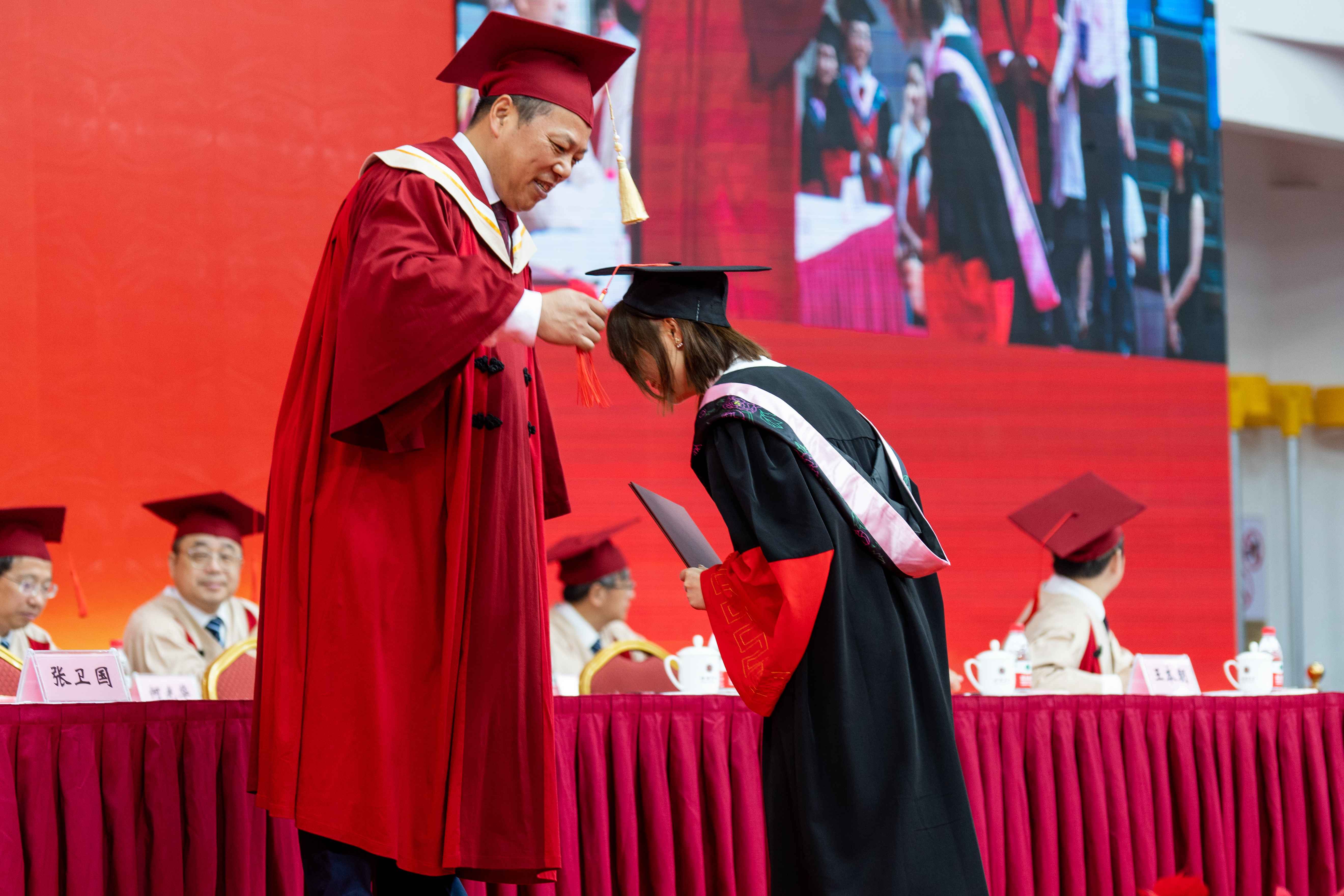 在主席台就座的领导为毕业研究生代表颁发毕业证书,为获得表彰的毕业研究生代表颁发荣誉证书。学校学位评定委员会主席、校长张卫国为博士学位获得者授予学位,学校学位评定委员会委员为硕士学位获得者授予学位。