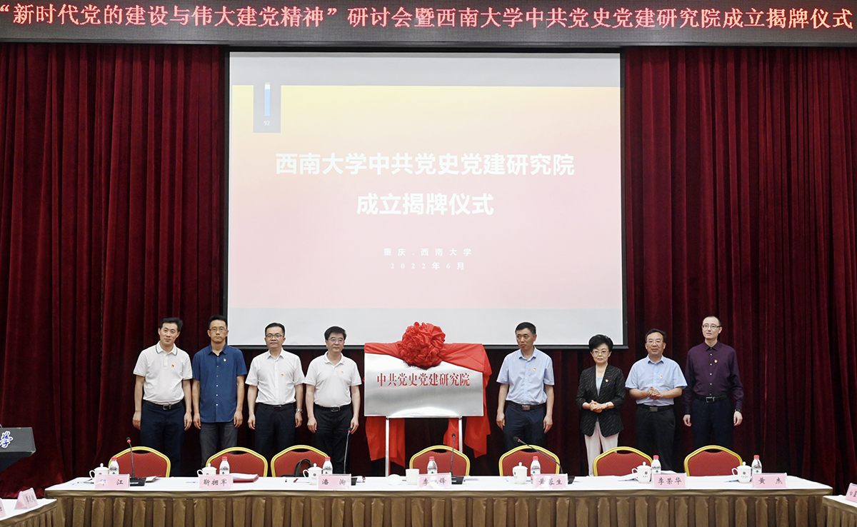 6月28日下午,“新时代党的建设与伟大建党精神”研讨会暨beat365在线唯一官网登录中共党史党建研究院成立揭牌仪式在学校桂园宾馆举行。学校党委书记李旭锋,党委副书记、马克思主义学院党委书记潘洵,北京师范大学中共党史党建研究院院长王炳林,国务院学位委员会马克思主义理论学科评议组召集人黄蓉生出席会议,学校相关职能部门负责人、中共党史党建研究院骨干成员、马克思主义学院科研创新团队成员、部分教师研究生代表参加会议。