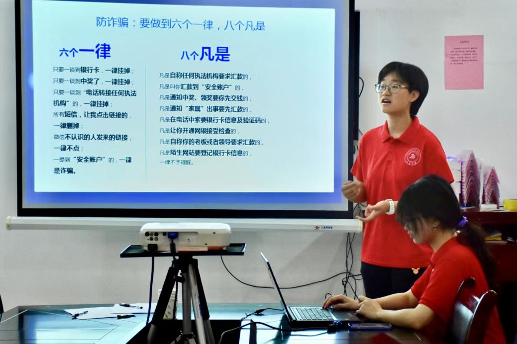 实践服务团成员为社区居民开展以“喜迎二十大,忠诚保平安”为主题的防诈骗讲座。从案情介绍、特点分析、类型总结等方面,成员们为居民讲解贷款、赌博、网络诈骗等诈骗陷阱,呼吁大家在生活中要遵循“六个一律,八个凡是”的原则,谨防上当受骗。