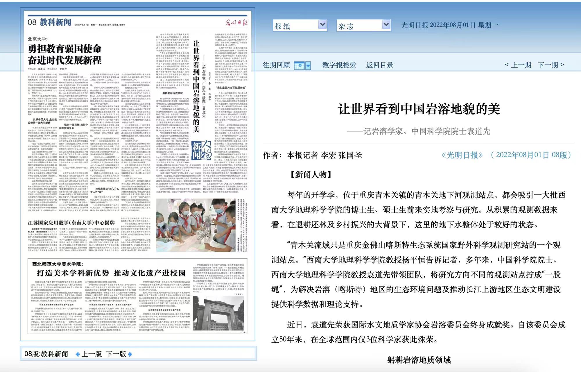 8月1日,《光明日报》第八版报道学校袁道先院士躬耕地质岩溶研究七十载如一日的艰辛历程与动人故事。可以说,此次报道的题目“让世界看到中国岩溶的美”,即为对袁道先院士一生奉献给地质研究的最好概括,也是他毕生以之不断奋进突破的信条和钟爱。