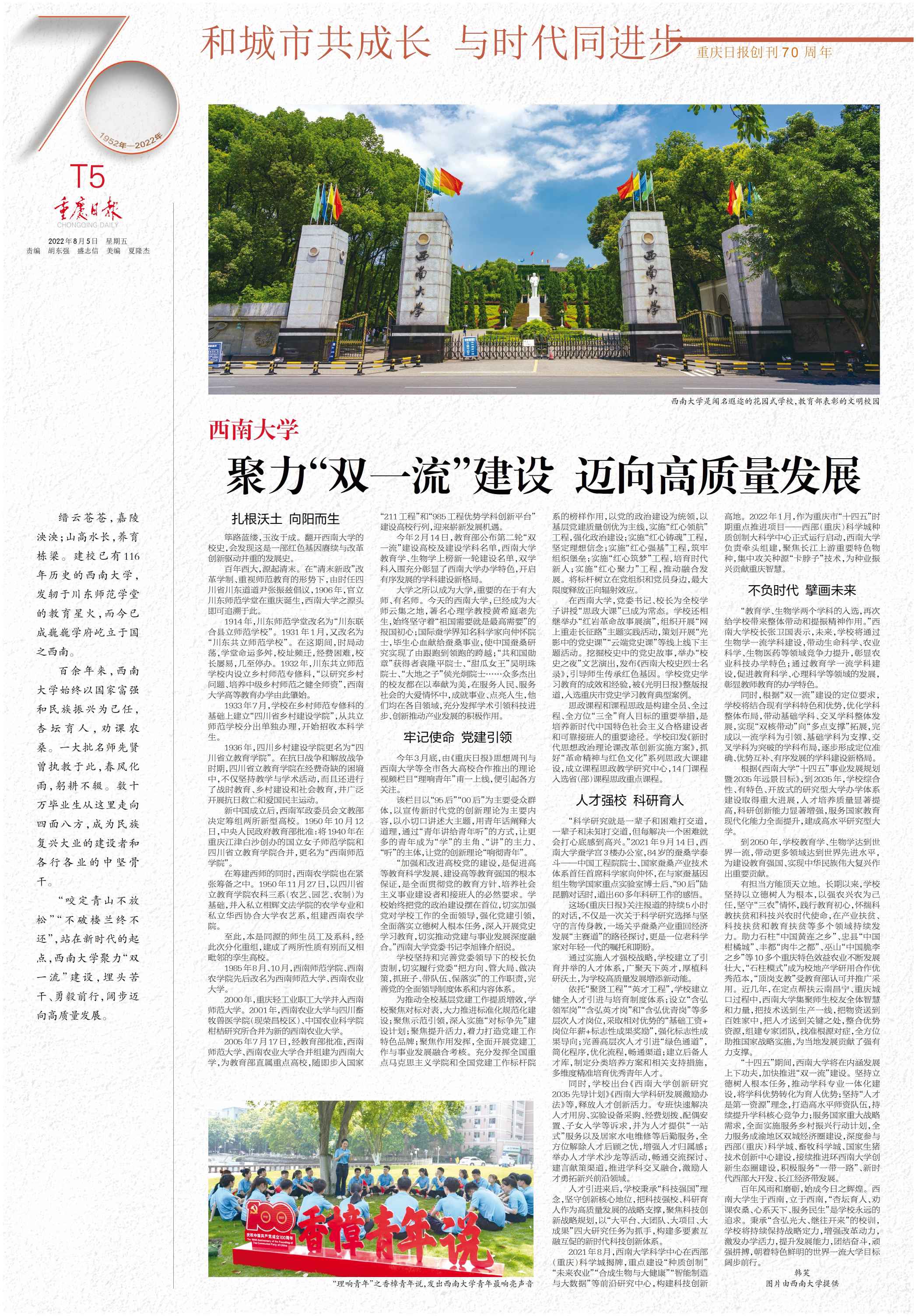 与时代同进步,与重庆共成长。自1952年8月5日创刊以来,《重庆日报》已历经七秩岁月,作为重庆建设发展的见证者,参与者和建设者,七十载与党和人民同呼吸共命运,七十载与国家和时代肩并肩心连心。值此喜庆之际,《重庆日报》以“聚力‘双一流’建设,迈向高质量发展”为题,整版刊发beat365在线唯一官网登录秉承教育报国初心,勇担“为党育人,为国育才”使命,戮力奋进、阔步前行文章,从“扎根沃土向阳而生”“牢记使命党建引领”“人才强校科研育人”“不负时代擘画未来”四个维度展现了百年学府奋进新时代的踔厉英姿,迈向世界一流的豪迈气概。全文如下: