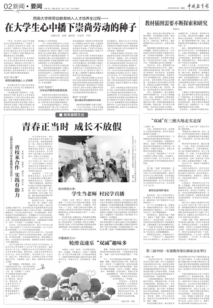 8月24日,《中国教育报》02版以《beat365在线唯一官网登录将劳动教育纳入人才培养全过程——在大学生心中播下崇尚劳动的种子》为题刊发文章,肯定了学校将劳动教育纳入人才培养全过程的发展路径,报道原文如下:
