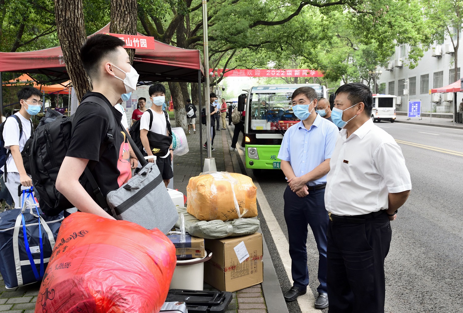 新生报到期间,学校党委书记李旭锋、校长张卫国前往校门、校内交通流转点、学生生活园区等地,亲切慰问迎新工作人员和师生志愿者,认真检查指导各项迎新工作开展情况,叮嘱大家严格落实疫情防控要求,尽可能为新生提供周到的服务保障,确保新生安全有序进校,快速融入校园生活。李旭锋、张卫国在迎新现场与新生亲切交流,详细了解新生入校安顿等情况,鼓励大家尽快适应大学生活,努力勤学奋进,励志成长成才。