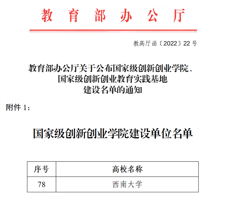 为服务实施创新驱动发展战略,适应经济社会发展对人才培养的新要求,学校全面深化创新创业教育改革,优化创新创业教育资源配置机制,始终坚持“心在最高处,根在最深处”的创新创业教育理念,着力构建 “一个中心、五大体系”创新创业育人生态,即以学生全面发展为中心,构建高质量的双创课程、训练竞赛、孵化平台、双创文化和效果评价为一体的创新创业育人体系,推进创新创业教育与思想政治教育、专业教育及实践教育有机融合,与“新工科、新医科、新农科、新文科”建设深度结合,建设以创新创业为导向的新型人才培养模式,全面提高人才培养质量。学校入选首批国家级创新创业学院建设单位,同时先后荣获全国高校实践育人创新创业基地、国家级高校学生科技创业实习基地、全国农村创新创业孵化实训基地、首批西部(重庆)科学城大创谷卫星园建设高校、成渝地区双城经济圈高校创新创业联盟理事长单位等称号。在第六届和第七届中国国际“互联网+”大学生创新创业大赛全国总决赛中,获4金6银5铜,荣获“高校先进集体奖”。广大学生扎根祖国大地,在创新创业实践中增长才干,创新创业意识和能力明显增强,各类创新创业实践活动参与面达90%以上,校园创新创业文化氛围日趋浓厚。