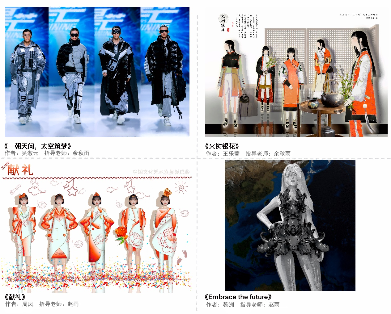 近日,由中国文化艺术发展促进会主办的“文化强国——献礼党的二十大”线上主题艺术展开展。本次艺术展共展出国画、书法篆刻、油画、版画、雕塑、公共艺术、陶瓷、当代艺术、水彩、服装等各类作品300余幅,学校蚕桑纺织与生物质科学学院学生黎洲、周凤、王乐萱、吴淑云的服装作品《Embrace the future》《献礼》《火树银花》《一朝天问,太空筑梦》成功入选并展出。