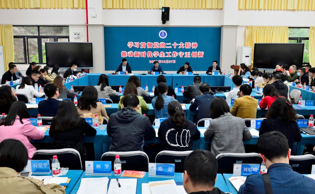 10月27日下午,学校学工系统举行“学习贯彻党的二十大精神 推动新时代学生工作守正创新”座谈会。学校党委副书记潘洵出席活动,党委研究生工作部、党委学生工作部、招生就业处等单位负责人,全体二级党组织副书记和辅导员代表等90余人参加活动,沙龙由党委学生工作部部长许克松主持。