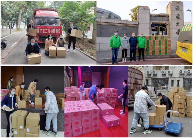 据悉,捐赠情况如下:重庆钰鑫实业集团有限公司(校友企业)捐赠价值60000元的功能性饮料15000瓶;重庆德庄实业集团有限公司(校友企业)捐赠价值34560元的自热火锅方便速食1152份;重庆金羚羊电子商务有限公司捐赠价值21575元的自嗨锅煲仔饭、火锅、冲泡面,合计1234份;重庆佳仙九七食品有限公司捐赠价值19900元的佳仙自热米饭1000份;重庆琪馨食品有限公司捐赠价值14400元的椿林自加热米饭1200份;重庆市黄海食品有限公司捐赠价值5000元的冲泡型速食粉条1000份;重庆三间田农业开发有限公司捐赠价值6000元的3000斤蔬菜。