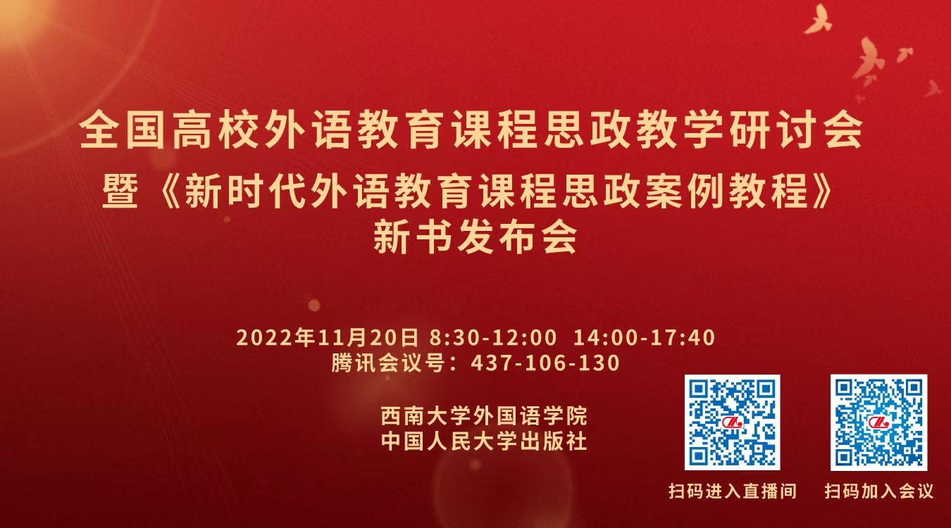 近日,外国语学院联合中国人民大学出版社成功举办全国高校外语教育课程思政教学研讨会暨《新时代外语教育课程思政案例教程》新书发布会。来自北京外国语大学、南开大学、华中科技大学等20余所高校的专家学者出席本次会议,共同研讨了新时代高校外语教育课程思政的教学思路和实践路径。本次会议以线上方式举行。
