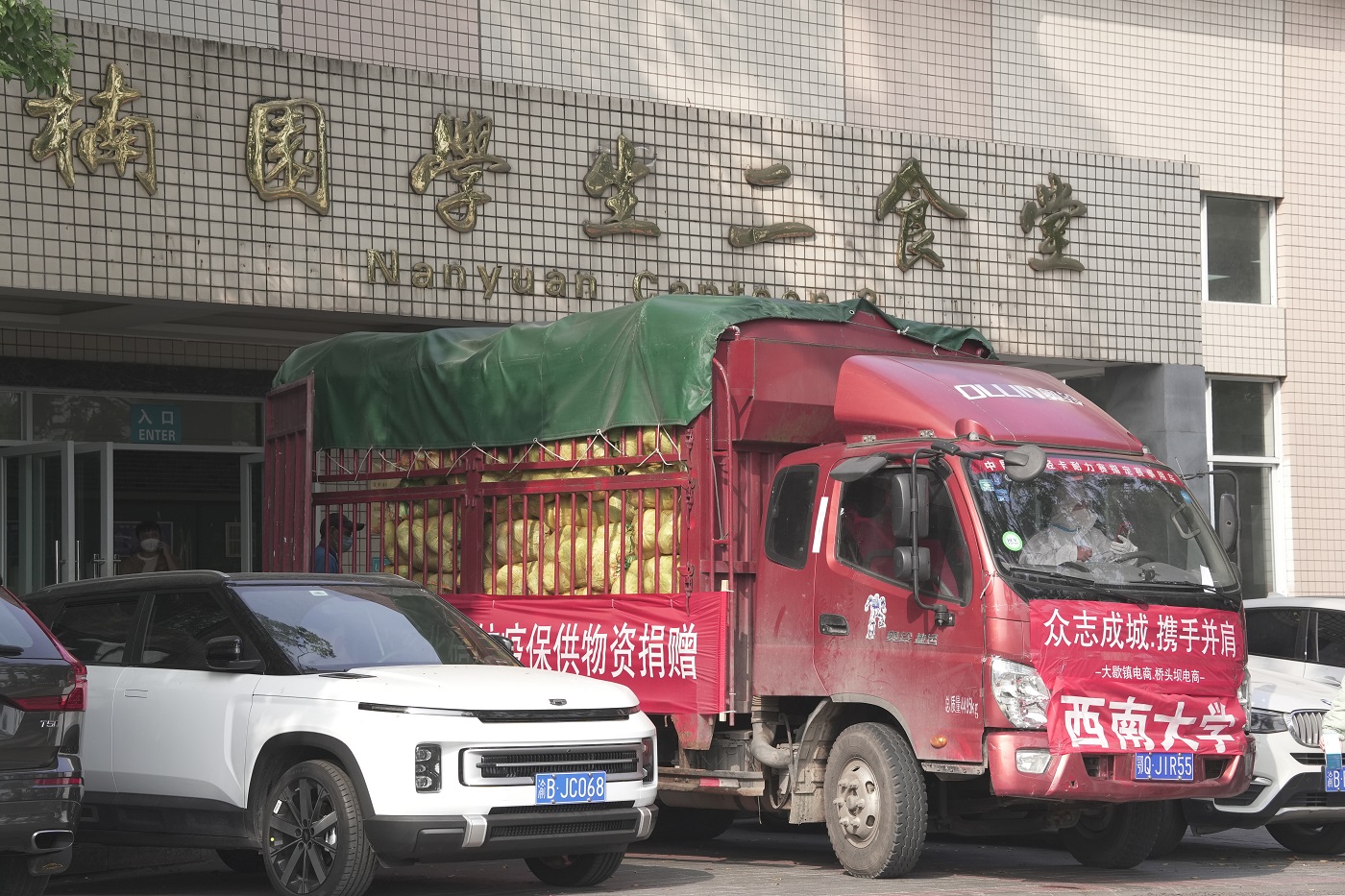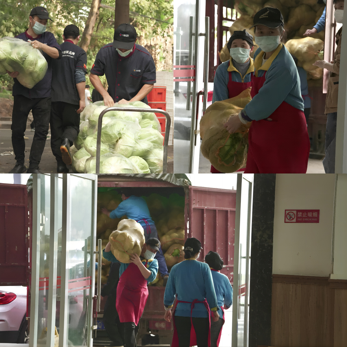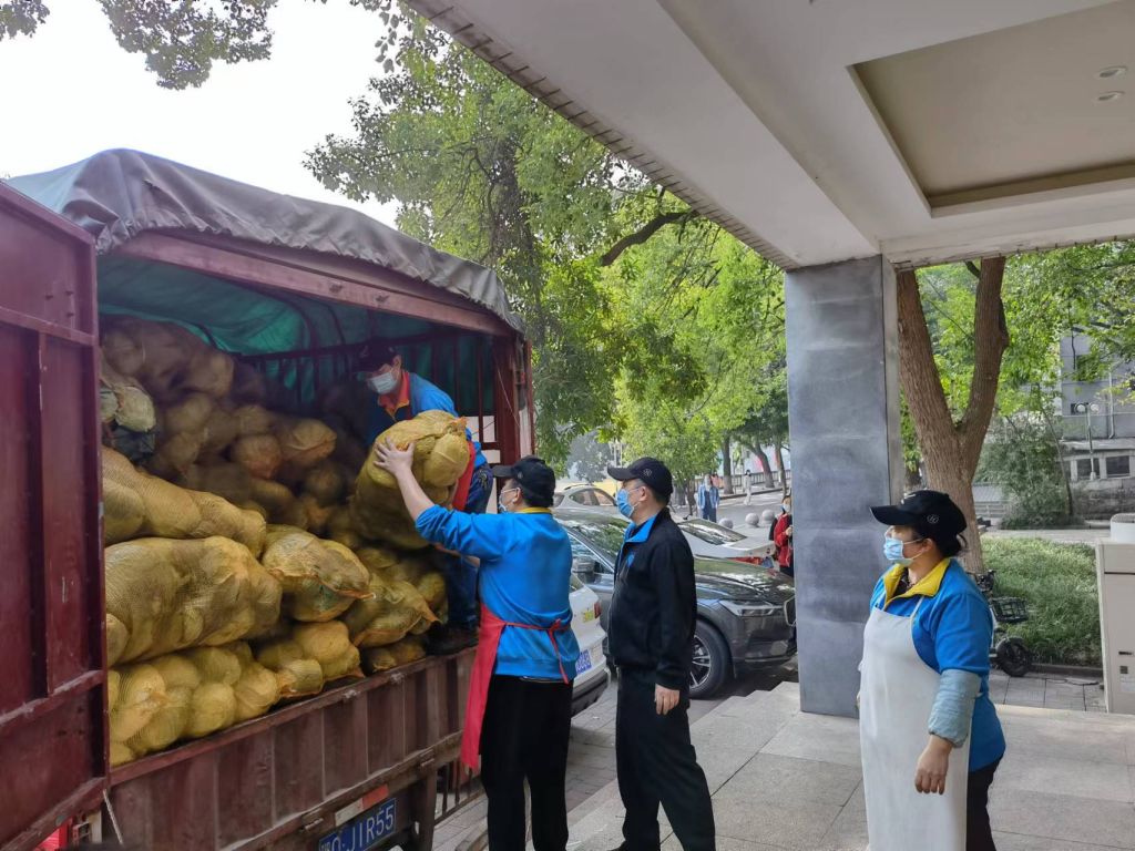 经过近300公里的运输,爱心蔬菜分3批运抵学校,在严格执行防疫消杀程序后,分送至校园内各学生食堂。