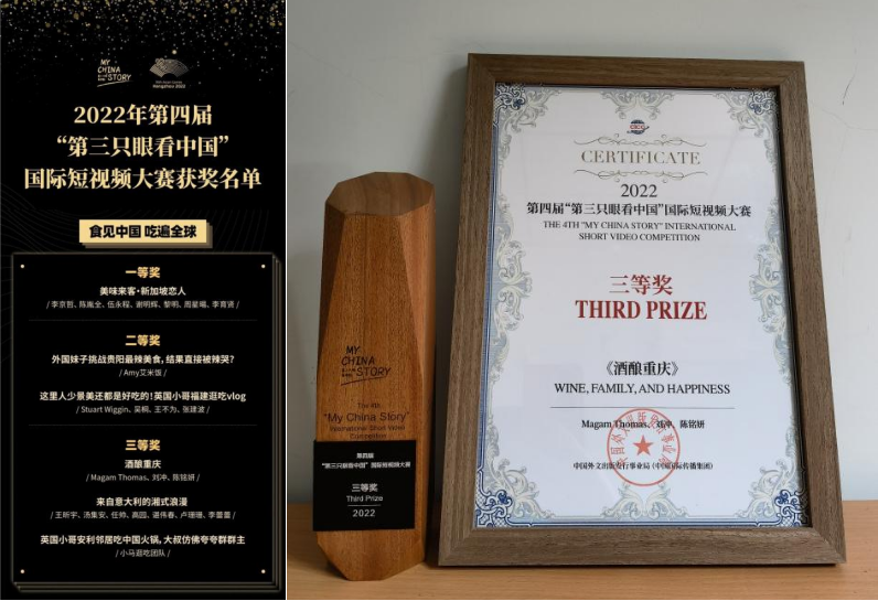 日前,2022“看中国·外国青年影像计划·重庆行”创作影片《酒酿重庆》在2022年第四届“第三只眼看中国”国际短视频大赛中荣获三等奖。该影片由尼日利亚籍留学生Magam Thomas与新闻传媒学院2021级电影专业研究生刘冲共同创作,讲述了重庆市江津区驴溪酒厂和江记酒庄里的酿酒故事。