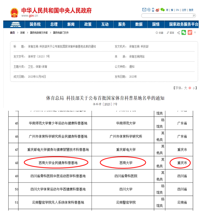 本次成功入选首批国家体育科普基地是对学校体育工作成效和社会影响力的充分肯定。近年来,学校体育学科建设和社会服务成效显著,体育学院2018年荣获体育学一级学科博士点,体育教育和运动训练两个本科专业获国家一流本科建设单位,入选教育部体育美育浸润行动计划,荣获全国群众体育先进单位,助力学校当选中国大学生体育协会网球分会主席单位,两届夏季奥运会斩获6金1银1铜,与重庆市体育局共建网球、田径、排球代表队,获批国家社科基金项目10余项。