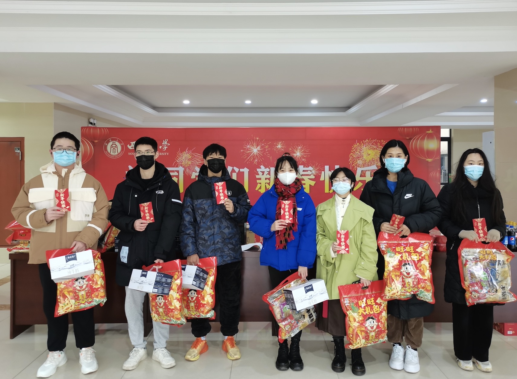 新春大礼包、拜年红包、自热米饭、饮料、口罩,捧着满满一大堆的新春礼物,同学们脸上洋溢着幸福的欢笑。同学们纷纷表示,虽然因为留在学校学习、没有回家过春节,但学校依然让大家感受到了满满的家的温暖,过了一个特殊却同样喜庆祥和的春节,今后会更加努力学习,力争新年取得更优异的成绩,为自己加油、为母校增光、为祖国祝福!