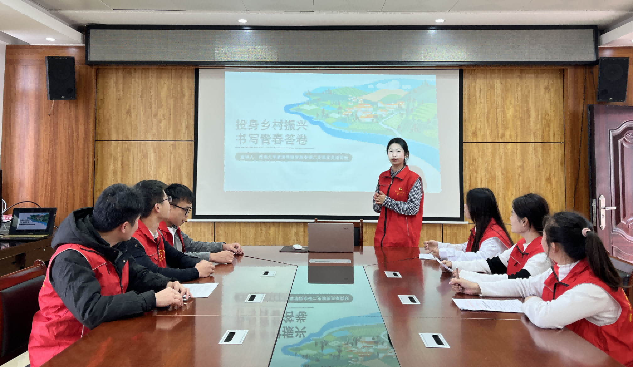 宣讲团成员梁莉欣在过去一年里回到家乡广西东兰县武篆镇担任兼职团委副书记。在即将期满卸任的最后日子里,她给前来接任的大学生团干们带来一场干货满满的“投身乡村振兴 书写青春答卷”的主题汇报。“在这一年里,我看到基层干部的年轻化,90后已经成为基层一线主力军,他们有足够的能力与毅力肩扛责任、引领群众、建设家乡。”梁莉欣围绕国家乡村振兴战略部署和新时代青年使命担当,结合担任国家政策宣传员、乡村青年组织员、家乡红色文化和特色产业推广员的一线工作感受、经验与收获,鼓励后辈大学生兼职团干们坚定信仰、信念、信心,用好所学,来一场与乡村振兴的“双向奔赴”。