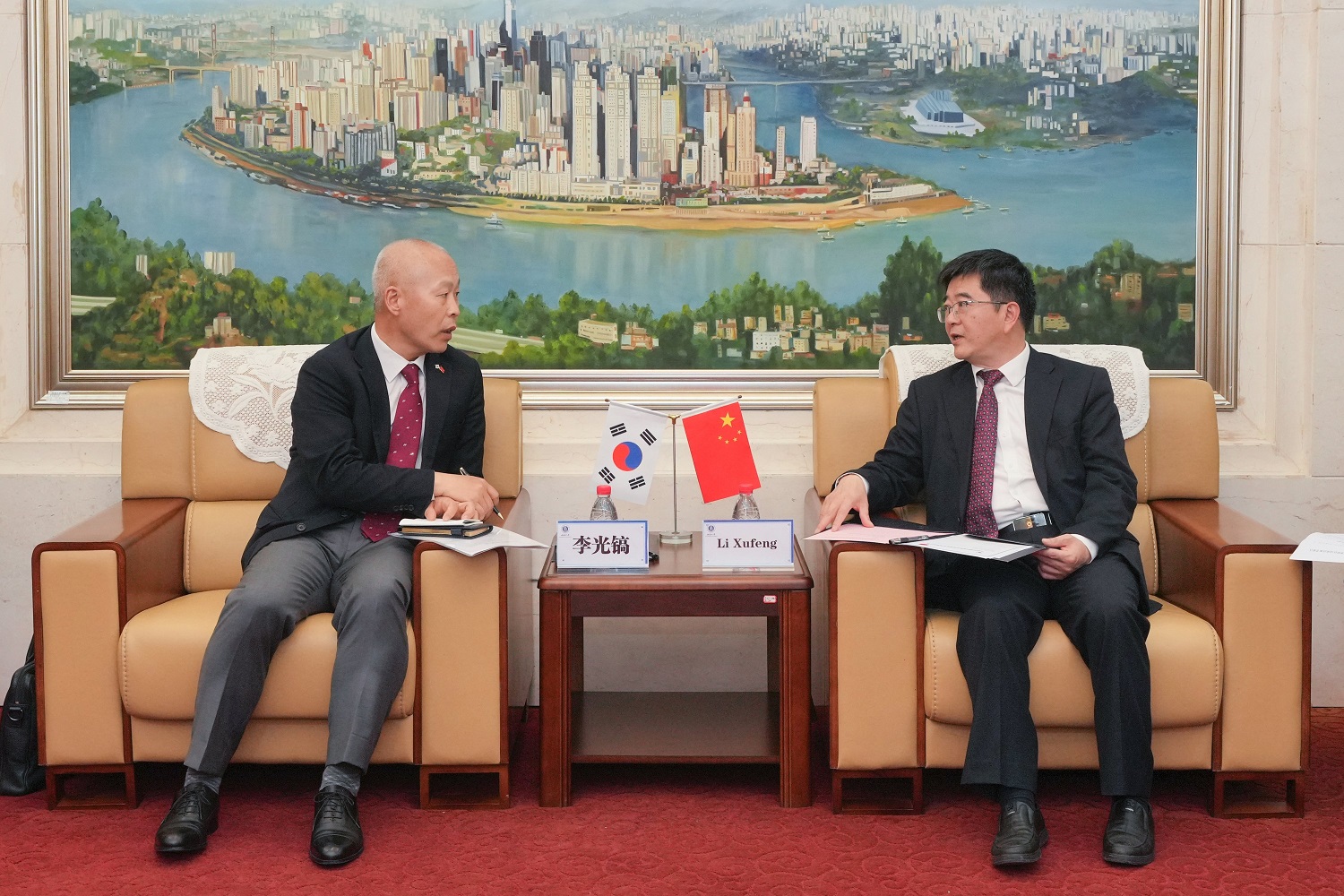 李旭锋对李光镐一行来访表示热烈欢迎,详细介绍了学校的历史沿革、办学规模、学科建设、校友资源、国际化建设以及与韩国高校交流合作情况。他指出,学校高度重视国际化工作,与韩国首尔大学、汉阳大学等11所高校建立了校际合作。希望通过总领事此次来访,推动学校与韩国高校在生物学、电子信息、人工智能等领域的深入合作,拓展双学位联合培养、师生互访和科研合作等项目,促进中韩两国高等教育发展。