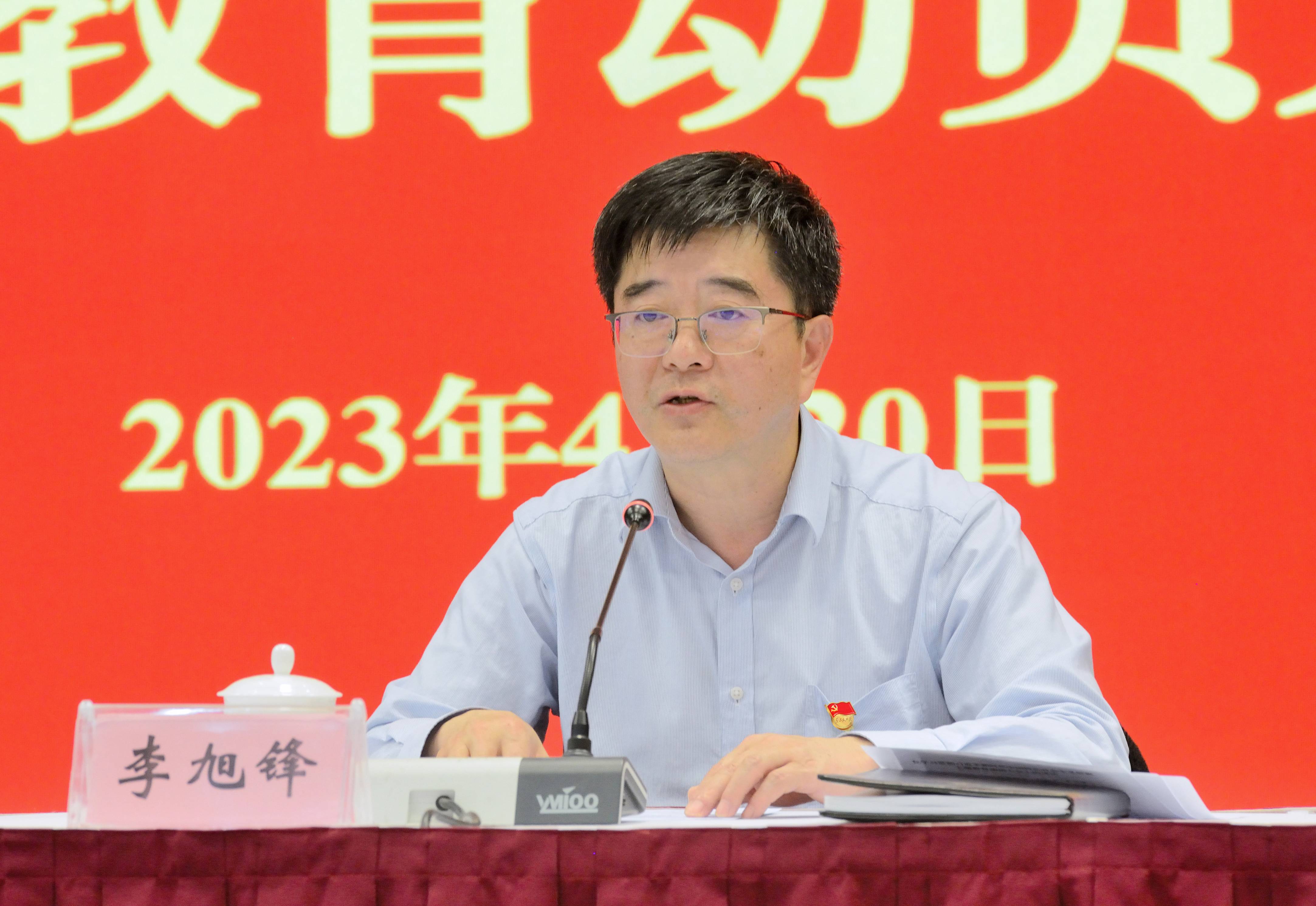李旭锋要求,要见行见效抓落实,高质量确保完成主题教育各项任务。严格按照党中央明确提出的自上而下、不划阶段、不分环节,把理论学习、调查研究、推动发展、检视整改贯通起来,有机融合、一体推进的要求,全面落实主题教育各项重点措施,高标准高质量开展好主题教育。要强化理论学习做表率,理论学习是本次主题教育的主线,要以开展主题教育为契机,进一步学深悟透习近平新时代中国特色社会主义思想,做到学思用贯通、知信行合一,在领会党的创新理论学习上有新收获,在把学习成果转化为推动工作务实举措上有新作为,要原原本本系统学、理论实际结合学、以上率下示范学、创新方式有效学。要大兴调查研究解难题,按照中央关于大兴调查研究的部署,落实教育部“四有”要求,通过调研促作风转变、促能力提升、促科学决策、促问题解决、促工作落实,要有目标设计方案、有组织下沉一线、有案例典型示范、有效果清单呈现。要推动内涵发展开新局,推动高质量发展是主题教育的重要着力点,紧紧围绕高质量发展首要任务,加快推进贯彻落实党的二十大精神开局之年各项任务,全力以赴开创“十四五”发展新局,要聚焦聚力高质量发展、聚焦聚力高水平治理、聚焦聚力高效能服务。要从严检视整改求实效,检视整改直接关乎主题教育的实际成效,要坚持边学习、边对照、边检视、边整改,要找准突出问题、抓好整改整治、做实建章立制。
