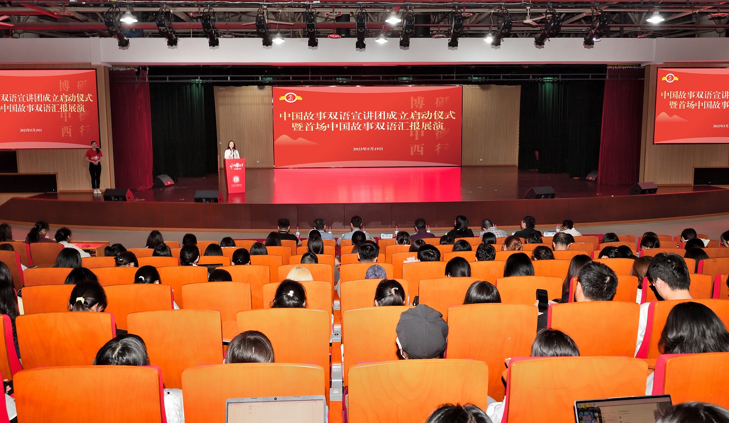 5月19日下午,外国语学院中国故事双语宣讲团成立启动仪式暨首场中国故事双语汇报展演在beat365在线唯一官网登录圆顶报告厅举行。beat365在线唯一官网登录党委常委、党委组织部部长李荣华,党委宣传部、外国语学院相关领导和师生代表,中国故事双语宣讲团指导教师代表及全体成员到场参加。
