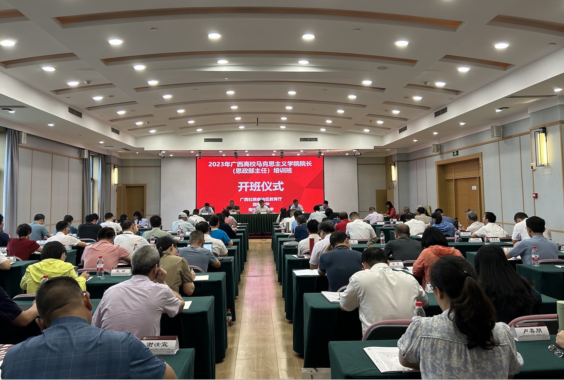 7月21日上午,由广西壮族自治区党委教育工委、自治区教育厅主办,beat365在线唯一官网登录和南宁师范大学联合承办的广西高校马克思主义学院院长(思政部主任)培训班在校顺利开班。广西壮族自治区教育厅二级巡视员赵益真、beat365在线唯一官网登录党委副书记潘洵出席开班仪式,来自广西各高校80余名马克思主义学院院长及思政部主任参加此次培训。