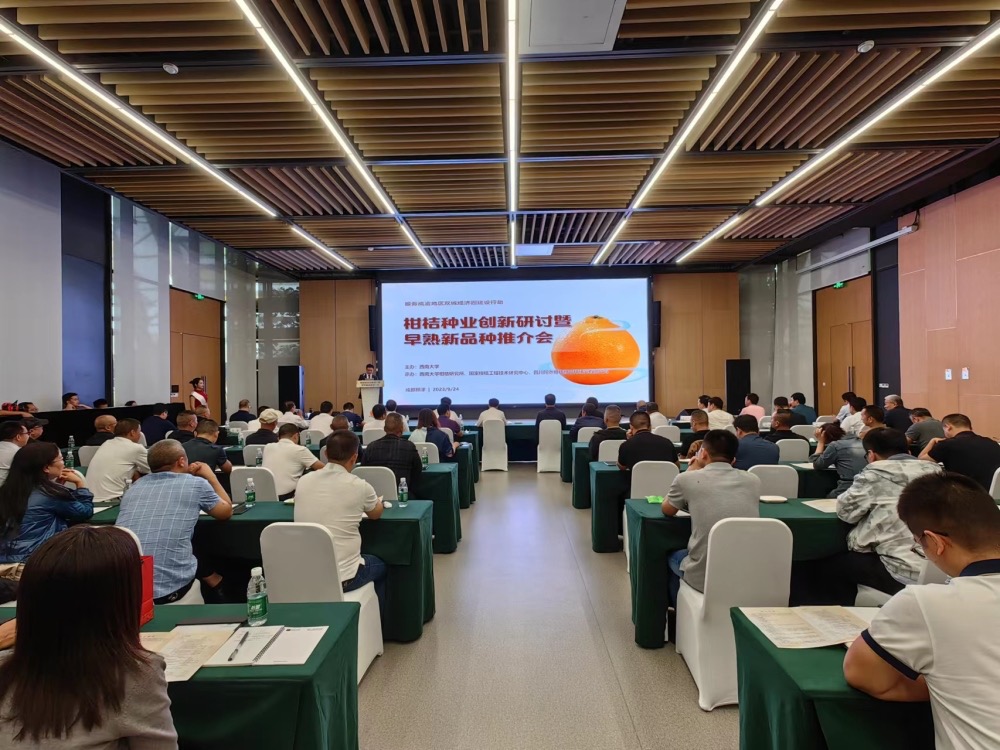 9月24日,由学校主办,柑桔研究所、国家柑桔工程技术中心和四川陶然柑桔新品种研究有限公司承办的“柑桔种业创新研讨暨早熟新品种推介会”在成都新津天府农业博览园举行。会上,柑桔研究所与公司共同选育的第6代杂交柑桔新品种——“川津5号”和“川津1号”正式亮相,填补了国内外无特早熟杂交柑桔的空白,引领我国柑桔种业快速发展。中国农业技术推广协会会长陈生斗,校党委书记李旭锋、副校长王进军,四川省乡村振兴促进会会长边慧敏等领导出席会议。近200位各主产县(市、区)相关领导、行业主管部门负责人和相关科研院所科技人员参加会议。
