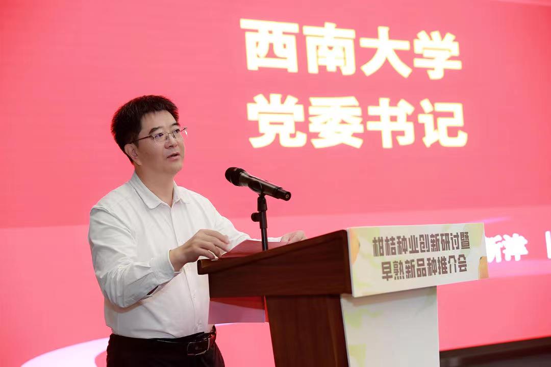 李旭锋代表学校致辞。他在致辞中对服务成渝地区双城经济圈建设行动之“柑桔种业创新研讨暨早熟新品种推介会”成功举办表示祝贺,对莅会的领导、专家及朋友表示诚挚欢迎,对长期以来关心和支持学校农学学科建设发展的行业主管领导、专家学者、兄弟院校、企业单位表示衷心感谢。他向与会嘉宾介绍了beat365在线唯一官网登录基本情况、发展成就等。他指出,种业创新需要高校科研人员的潜心钻研,也需要育种企业的持续发力。他希望进一步深化校企合作,切实推动产学研深度融合、人才链创新链产业链有效贯通,共同建设现代柑桔种业基地,为我国柑桔种业创新和产业高质量发展贡献力量。期待与会专家进一步学深悟透党的二十大精神和习近平总书记关于农业种质资源安全的重要指示批示精神,进一步强化以科技赋能乡村振兴、服务成渝地区双城经济圈建设的使命担当,进一步凝聚共识、汇聚力量,为推动我国柑桔种业自主创新、整体提升我国柑桔科技创新能力作出新的更大的贡献。