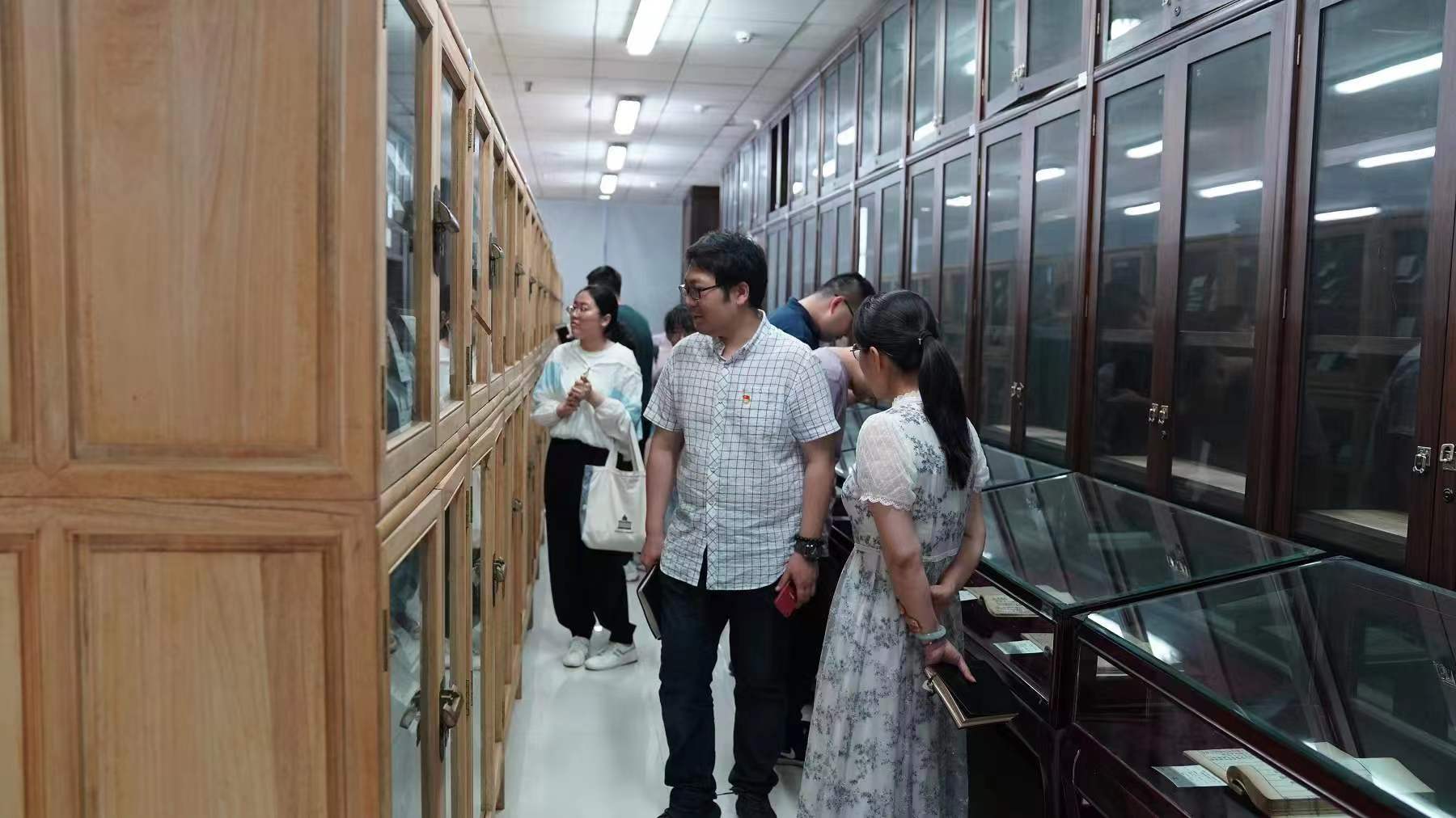 最后,在特藏部主任带领下,与会人员参观了图书馆民国文献书库和古籍书库,鉴赏了图书馆的珍贵馆藏——《唐人写百法名门论义记》复制件、《文章正宗》复制件以及十二部入选《国家珍贵古籍名录》的珍贵古籍。