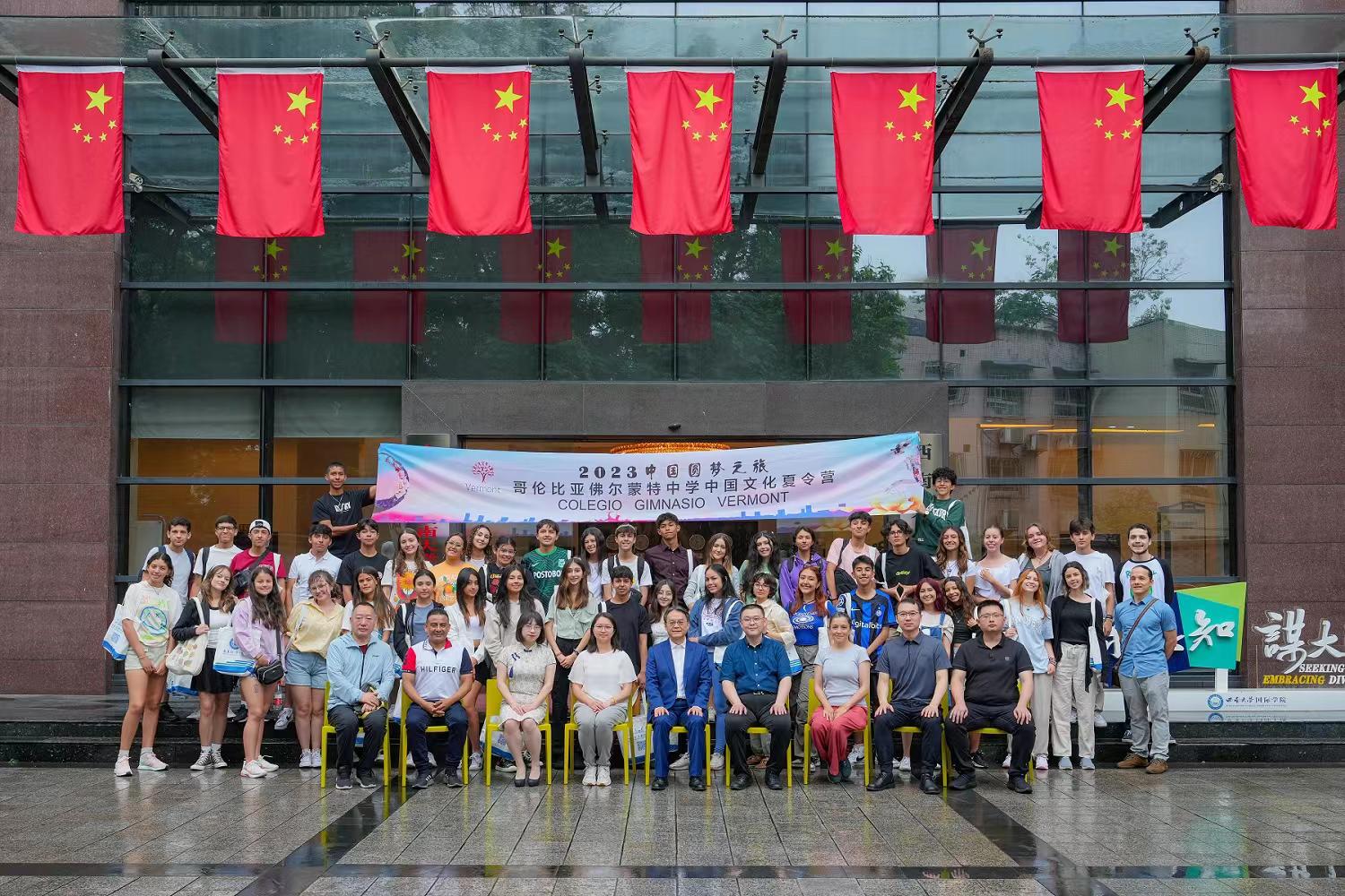 6月17日上午,“2023beat365在线唯一官网登录-哥伦比亚威尔蒙中学中国文化夏令营”开班仪式在国际学院紫云楼举行,来自哥伦比亚威尔蒙中学的46名师生来到学校,开启为期7天的参访学习。国际学院党委书记刘猛,中国对外文化集团有限公司文旅板块副总经理张猛,威尔蒙中学领队Naiver Lenith Niño Velásquez等参加开班仪式,仪式由外国学生招生工作办公室主任黄无为主持。