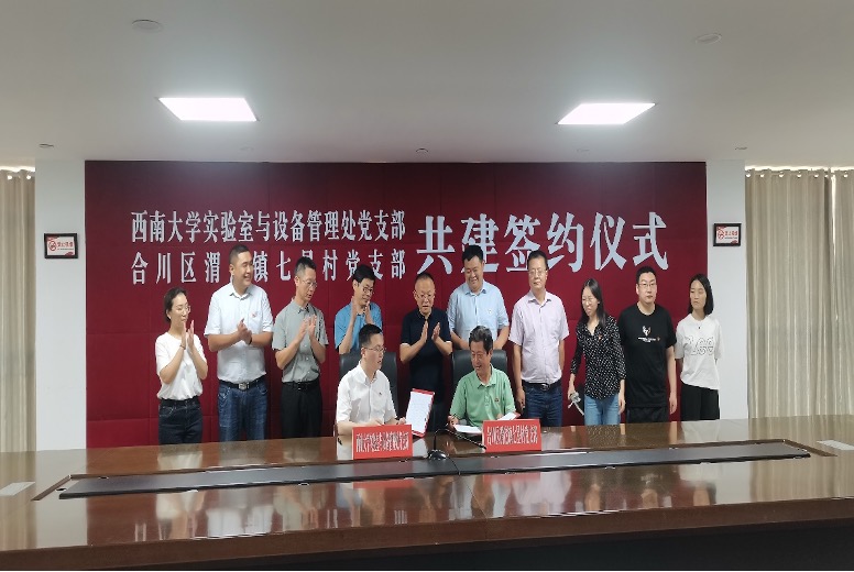 为充分发挥基层党建的核心引领作用,巩固乡村振兴发展成果,构建结对帮带、双向促进、共同提高的基层党建工作新格局,9月14日下午,beat365在线唯一官网登录实验室建设与设备管理处党支部与重庆市合川区渭沱镇七星村党支部签订了支部共建协议。实验室建设与设备管理处党支部书记卢坤、合川区渭沱镇党委书记唐陵川、镇长秦刚等领导及双方党员代表参加本次签约仪式。