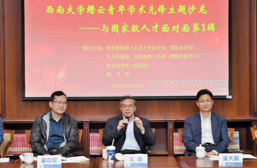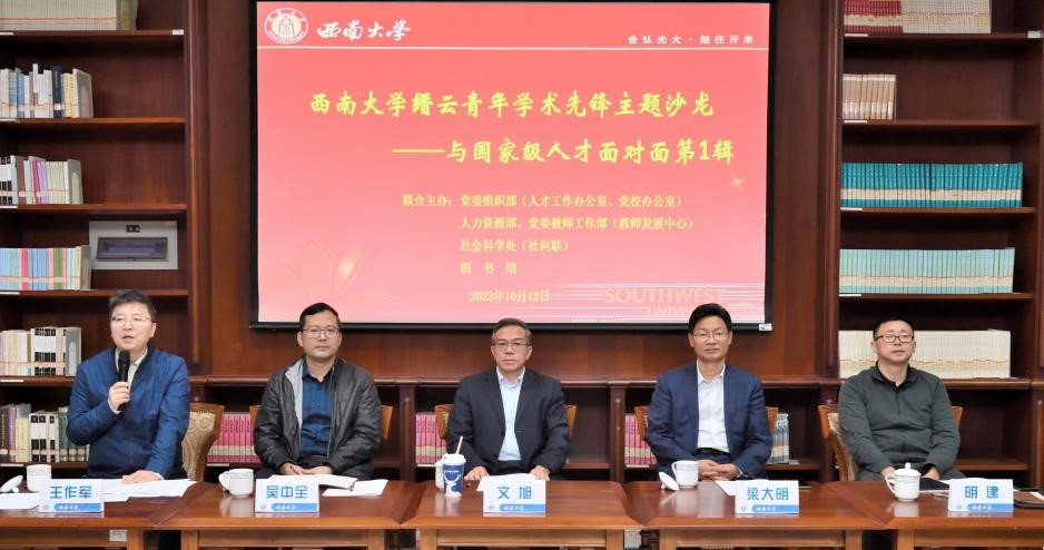 为更好地贯彻落实学校第三次党代会精神,以beat365在线唯一官网登录创新研究2035先导计划为引领,帮助新进老师提高科研能力,形成不同年龄段人才梯队,促进学校人文社会科学高质量发展,学校党委组织部(人才工作办公室)、人力资源部 党委教师工作部(教师发展中心)、社会科学处(社科联)、图书馆联合举办的beat365在线唯一官网登录缙云青年学术先锋主题沙龙——与国家级人才面对面第1辑于10月12日在中心图书馆举行。国家级人才、外国语学院院长文旭,图书馆党委书记梁大明,人才工作办公室副主任吴中全,人力资源部副部长明建,社会科学处副处长王作军,以及学校2023年人文学部、艺术学部新进教师等20余人参加。本次沙龙由社会科学处副处长王作军主持。