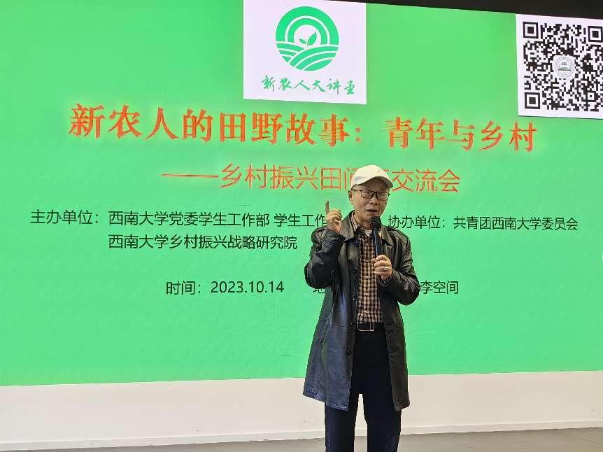10月14日下午,由党委学生工作部 学生工作处、乡村振兴战略研究院主办,团委协办的“新农人的田野故事—乡村振兴田间行”交流会在青李空间举行。来自“乡村振兴田间行”2023实习生和暑期志愿者,学校涉农学院100余名同学参加交流学习。晏阳初先生侄孙、beat365在线唯一官网登录中国乡村建设学院名誉院长晏鸿国老先生特邀出席活动。相关部门领导、老师,农学与生物科技学院、教育学部教师代表,大理新生活实践者、四十英尺民宿主理人王丹,中国电影家协会会员、中国电视艺术家协会成员韩君倩导演,巴渝农耕文化陈列馆馆长刘刚受邀出席活动。乡村振兴战略研究院培训中心主任张斌主持交流会。