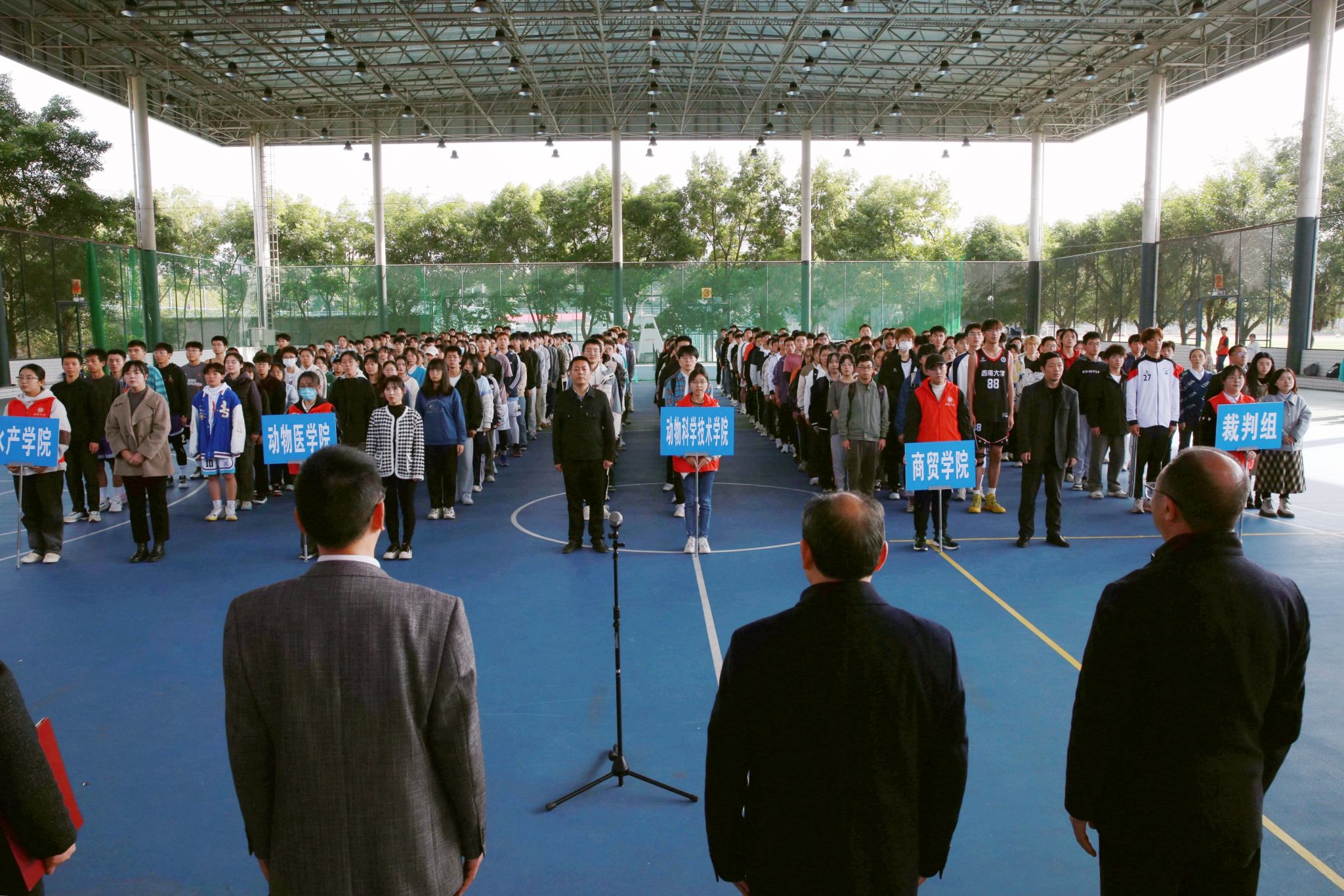 11月17日14:30,由beat365在线唯一官网登录体育运动委员会、beat365在线唯一官网登录荣昌校区党工委、管委会主办,beat365在线唯一官网登录荣昌校区学生工作办公室承办的beat365在线唯一官网登录荣昌校区第十九届“团建杯”球类联赛在荣昌校区风雨球场开幕。荣昌校区党工委书记周国安,荣昌校区党工委副书记、纪工委书记穆奎,荣昌校区综合办公室主任杨德生,在荣各学院党委副书记、团委书记及全体运动员、裁判员和在荣学院学生代表等参加开幕式,学校党委学生工作部(处)副部(处)长、荣昌校区学生工作办公室主任罗艳芬主持开幕式。
