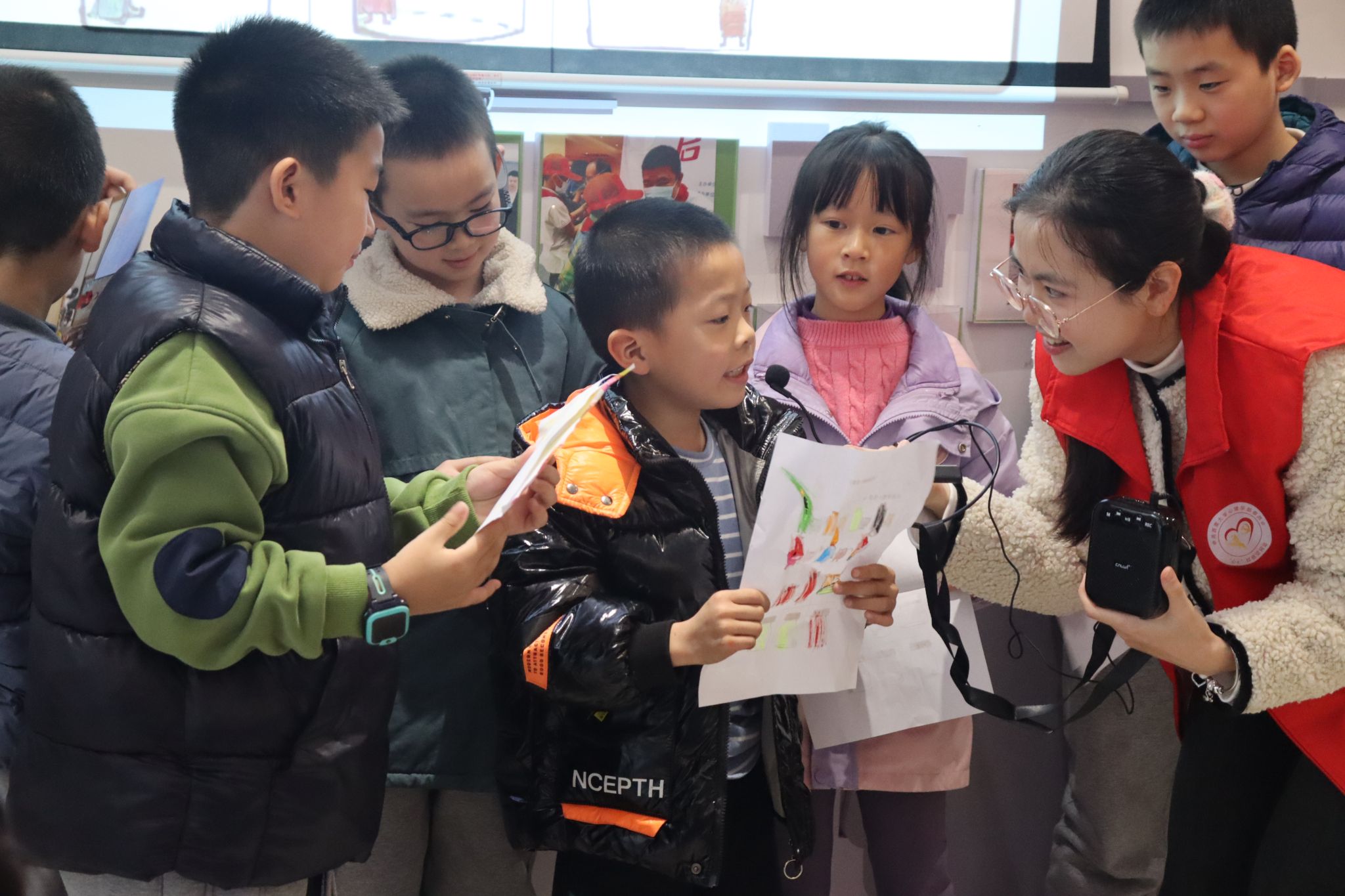 在认识不同情绪之后,志愿者带领小朋友们进行“房树人”心理绘画测验,并为每位小朋友的画作进行分析。在志愿者的积极关注和鼓励下,小朋友们在充满信任、温暖、理解的氛围中真实地开放自己,与志愿者分享自己的作品,体会绘画背后的含义。通过这一环节,搭建起通往儿童内心世界的桥梁,及时关注到儿童的心理状况,以提供个性化的心理健康指导。