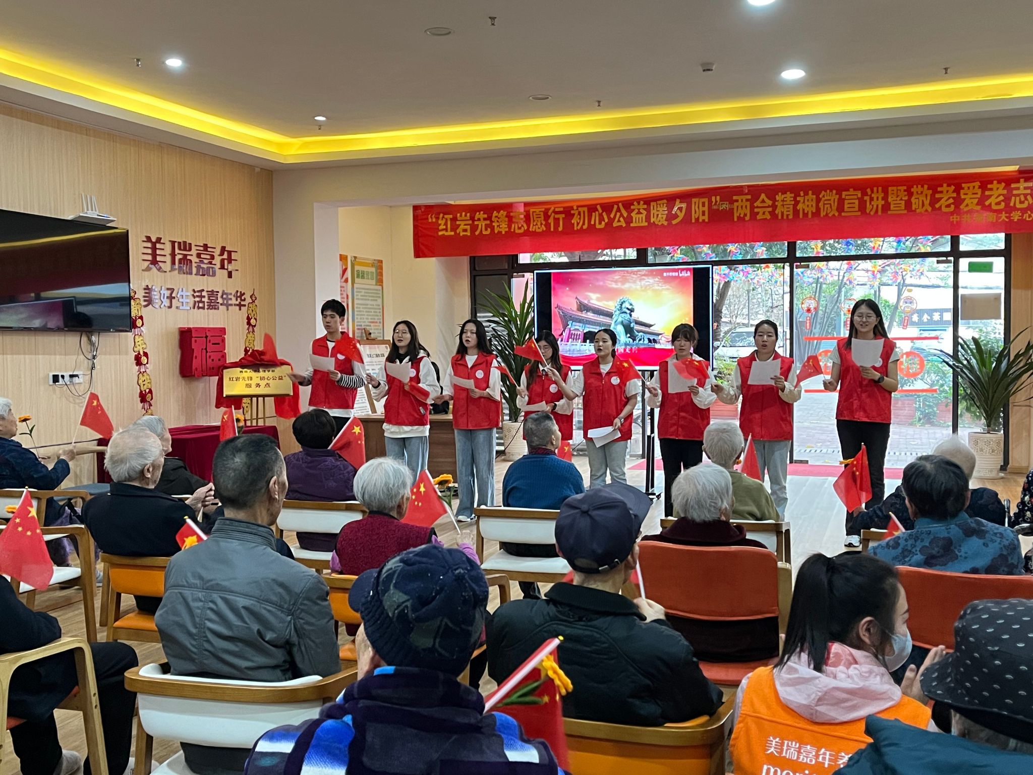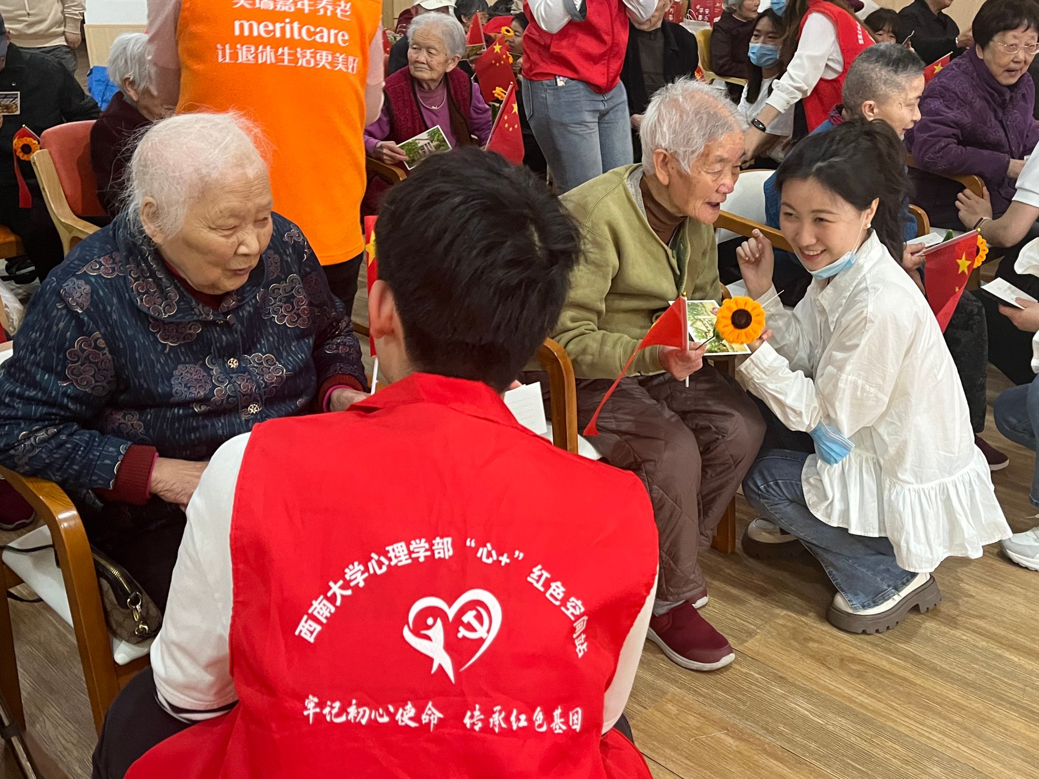 服务点的成立不仅为老年人提供了一个心理关爱的平台,也为党员志愿者提供了一个实践和锻炼的机会。当日,beat365在线唯一官网登录心理学部20余名志愿者在服务点开展了“红岩先锋志愿行 初心公益暖夕阳”两会精神微宣讲暨敬老爱老志愿服务活动。心理学部学生党建组织“心+”红色空间站站长丁汝向老年人进行了两会精神微宣讲,讲解了2024年全国两会中关于养老的议题政策,心理学部睡眠神经影像中心学生金巧进行了“宁心助眠”心理健康知识小讲堂,帮助老年人和养老服务工作者了解关于睡眠的心理学知识,并现场教授了深呼吸放松训练、正念冥想助眠等改善睡眠质量的实用技巧。“心+”红色空间站成员和各党支部志愿者与老年人进行“心灵驿站”交流,用明信片为老人们送上和煦温暖的“春日来信”,向老人分享自己所感受的美好春天,互动中或为老人捏捏肩、捶捶背,或仔细聆听老人诉说往事、说烦忧,让老人感受到春天般的温暖和舒适。活动中还穿插了志愿者们精心准备的古筝演奏、歌曲合唱等文艺表演。随着活动的进行,老人的孤独感渐渐得到排解,绽放出幸福的笑容。