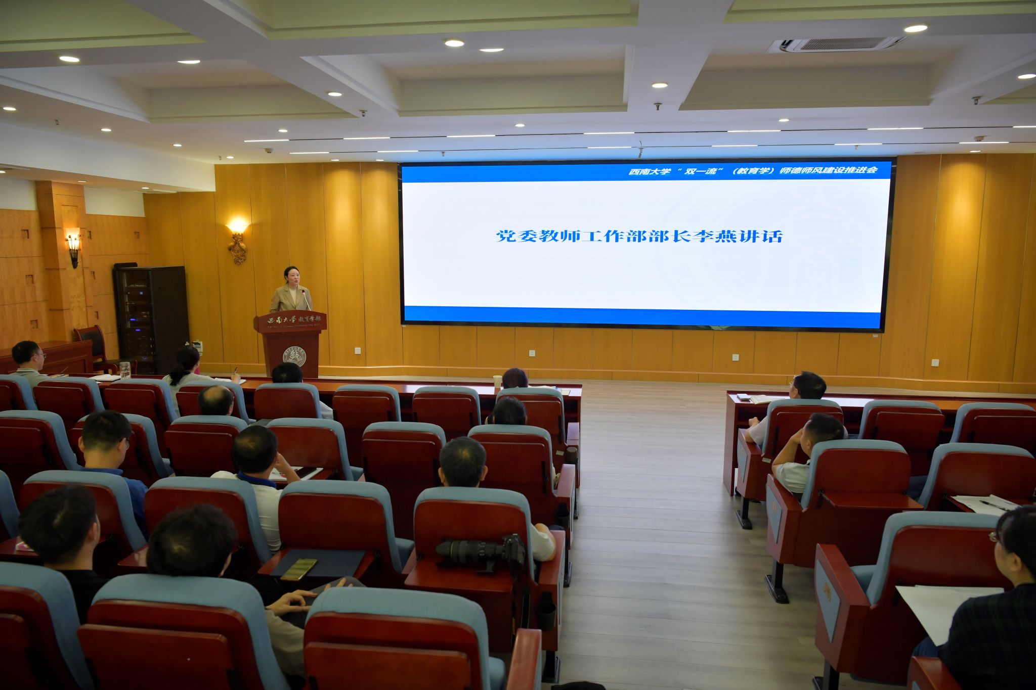 李燕部长以学校优秀教师事迹和违反师德师风警示案例切入,号召全体教师以“教育家精神”为指引,强化规矩意识和自律意识,坚持立德树人,潜心教书育人,争做“四有”好老师。