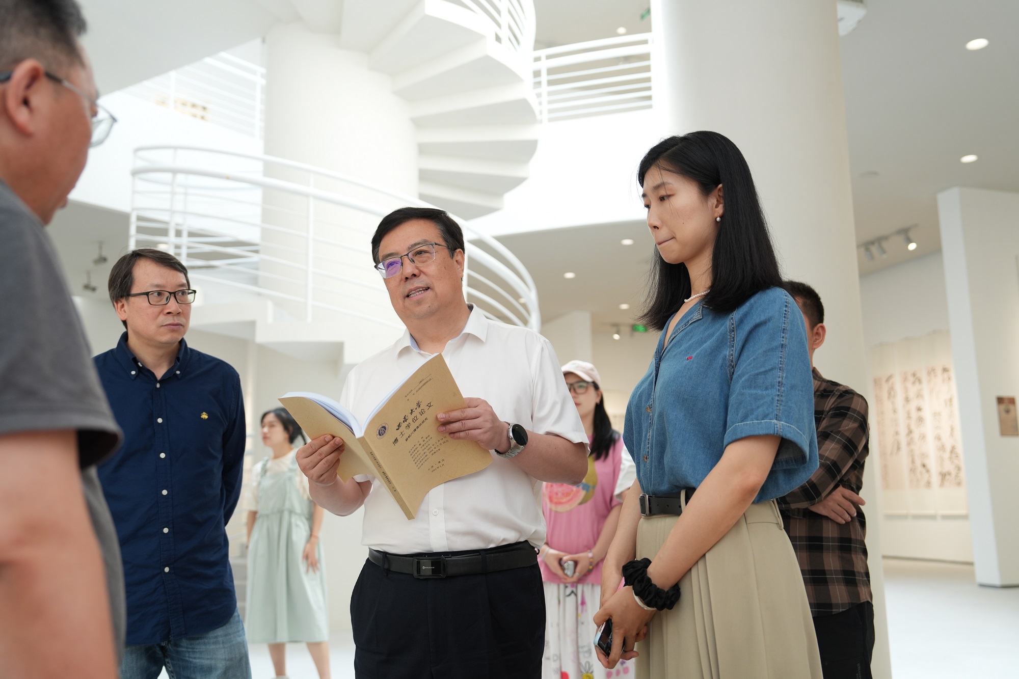 在beat365在线唯一官网登录中国书法研究所2024届毕业生作品展现场,王进军校长对艺术学科研究生培养工作进行了深入了解,与毕业生及指导教师曹建教授就学位论文质量、作品创作方向等进行了交流。王进军校长强调,要进一步强化研究生教育的过程管理与质量监督,深入发掘艺术学科研究生培养特色,紧扣学科发展前沿,不断培养造就更多德才兼备的高层次艺术人才。