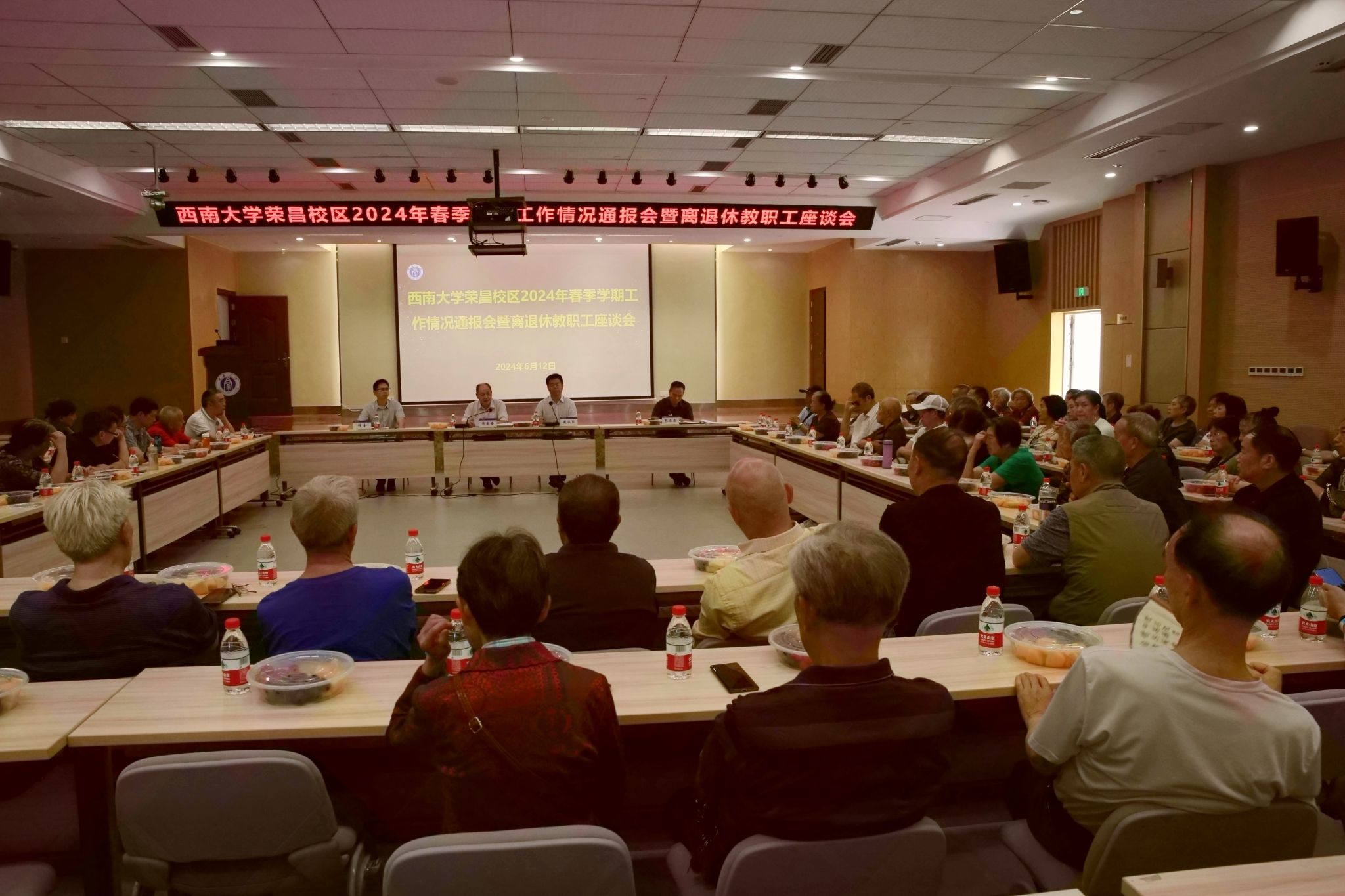 6月12日,beat365在线唯一官网登录荣昌校区2024年春季学期工作情况通报会暨离退休教职工座谈会在7B101报告厅举行,校区管委会主任赵永聚主持会议,校区党工委书记周国安通报工作情况。校区党工委副书记、纪工委书记穆奎,副处级组织员包尔泉出席会议,离退休工作办公室全体工作人员及70余名离退休教职工参加会议。