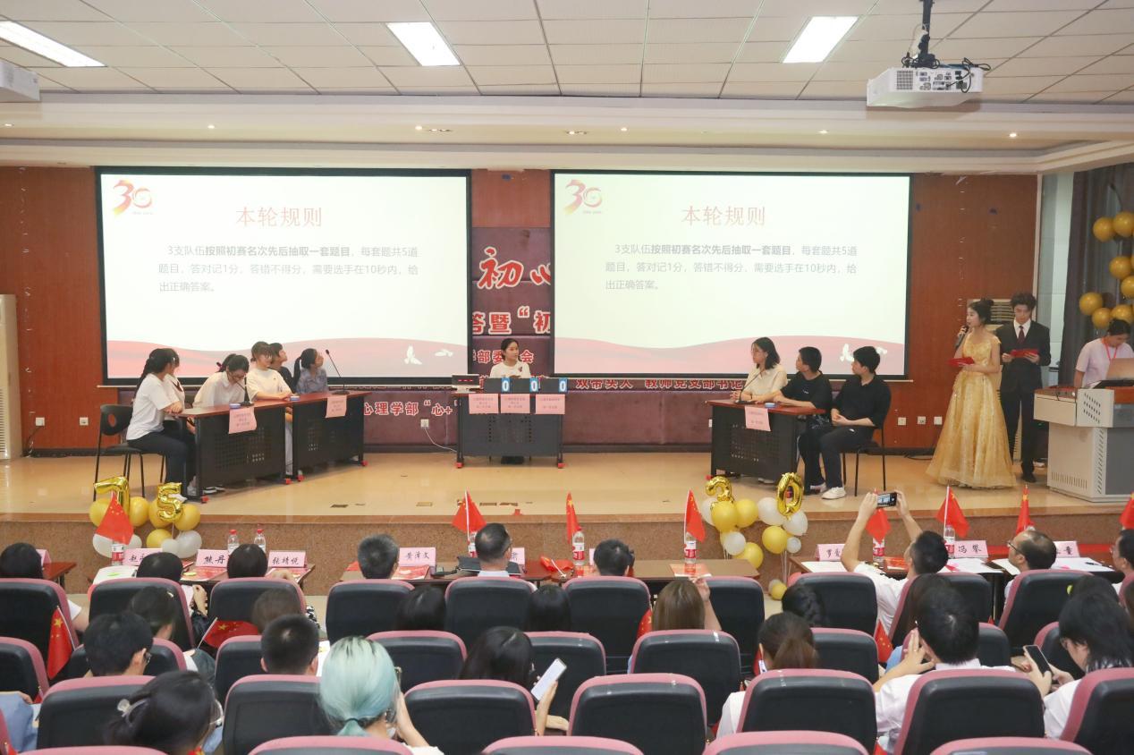 为庆祝中华人民共和国成立75周年、beat365在线唯一官网登录心理学部建系30周年,心理学部党委特别策划“庆华诞·忆初心·共奋进”为主题的系列党建活动。9月27日,系列活动的重头戏——“四史”知识竞答暨“初心”剧场展演决赛在学部415多功能厅举行。