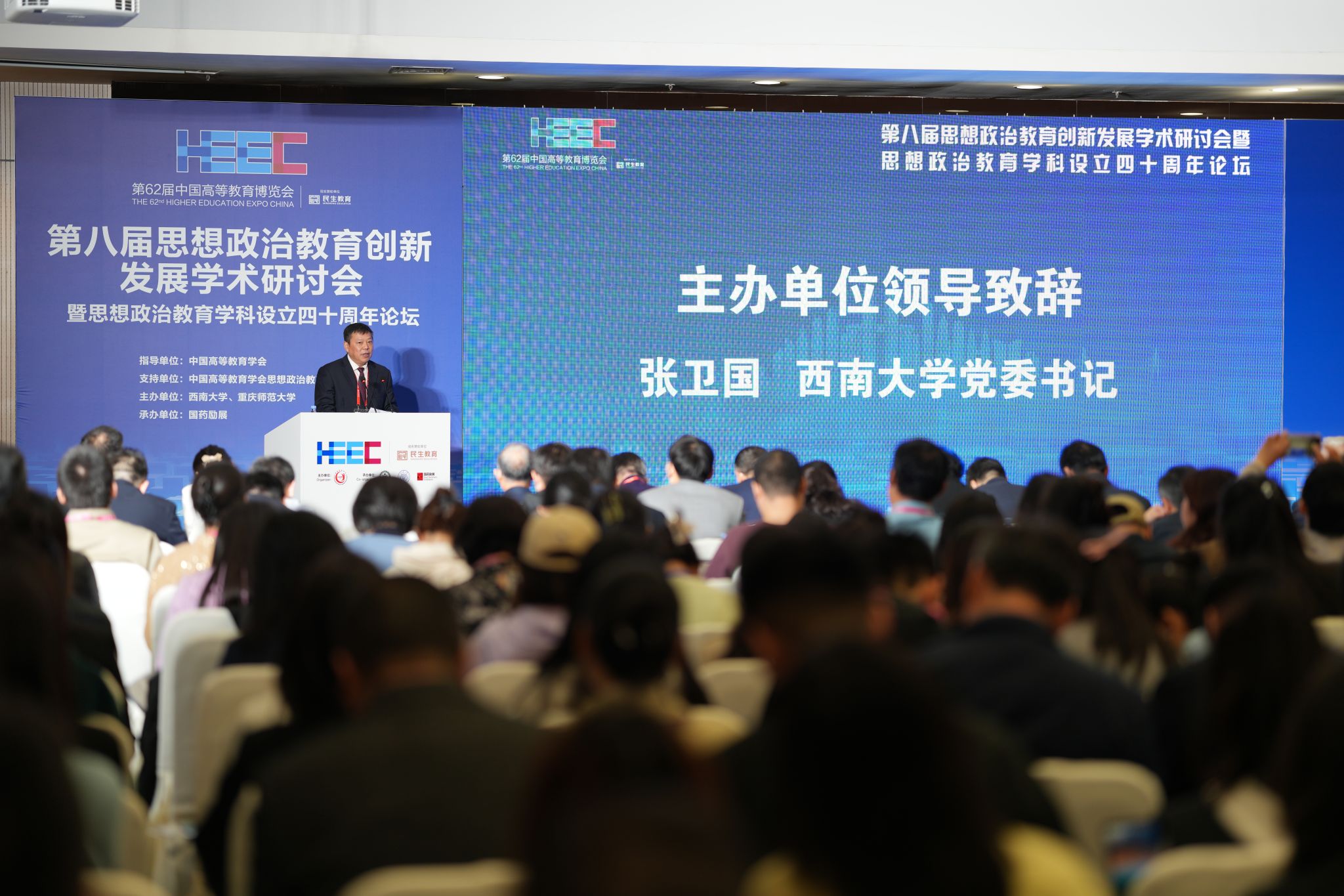 11月15日,第62届中国高等教育博览会在重庆开幕,学校参展并主办、承办多场系列活动。作为博览会同期学术活动之一的第八届思想政治教育创新发展学术研讨会暨思想政治教育学科设立四十周年论坛于当日同步举行。本次会议在教育部思想政治工作司、中国高等教育学会的指导和中国高等教育学会思想政治教育分会支持下,由学校和重庆师范大学共同主办,来自国内各大高校的300余名专家学者齐聚一堂共享思想政治教育学科建设成效、展望学科发展未来路向。
