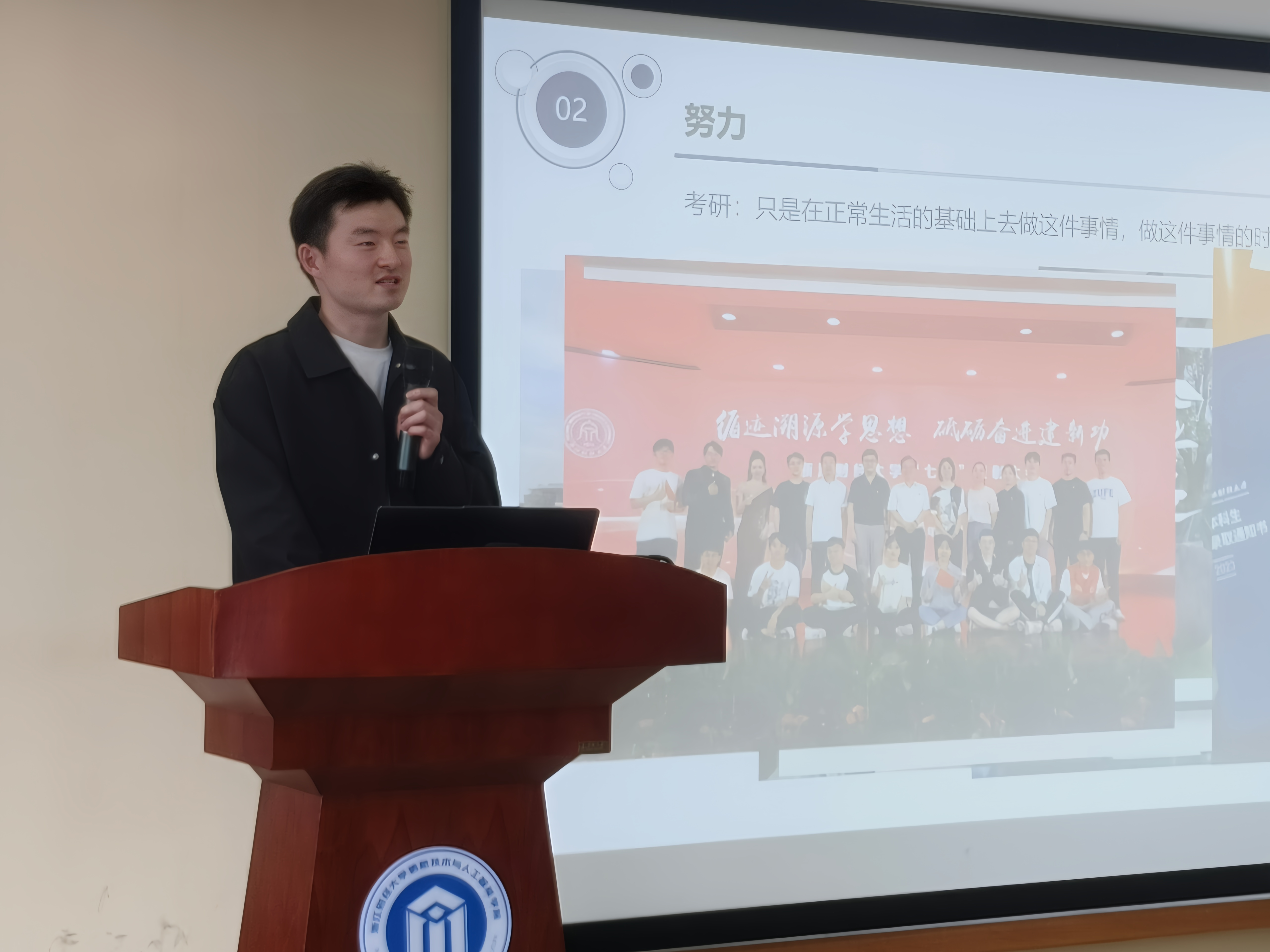 张有民学长根据自身经历,分享备考心路历程,建议同学们要结合自身情况理性选择备考院校,脚踏实地、行稳致远。他提醒同学们要劳逸结合,合理规划备考时间,在努力的同时,不要忘记生活还在继续。备考期间可以多运动(跑步、羽毛球、游泳都是很好的选择),与好友出去走走等来放松自己,以此获得继续前进的动力。