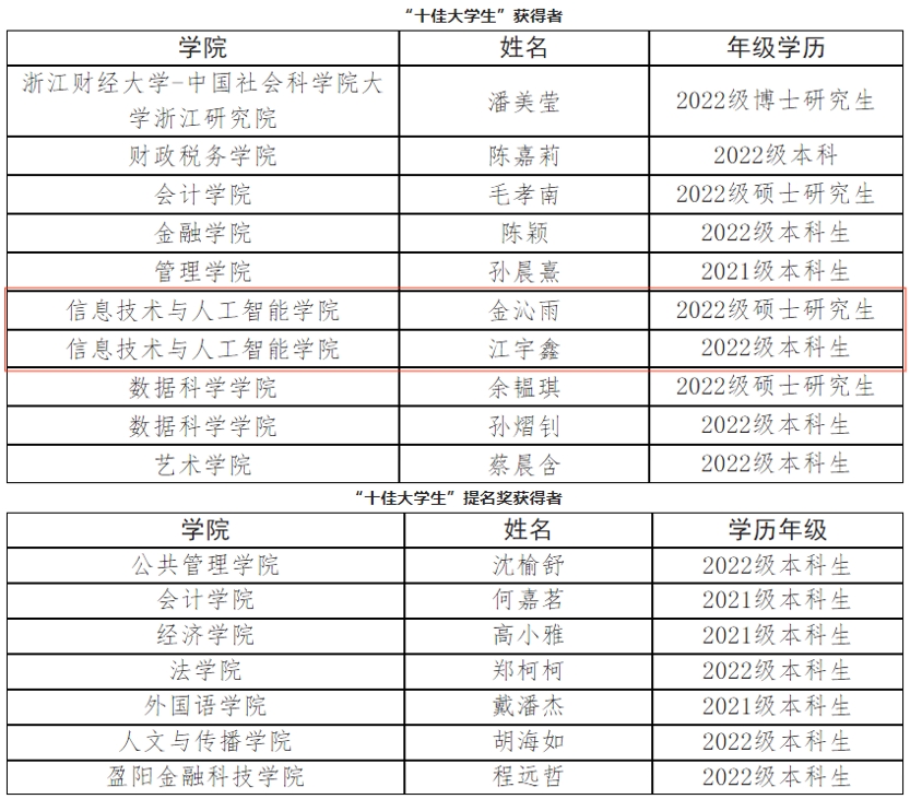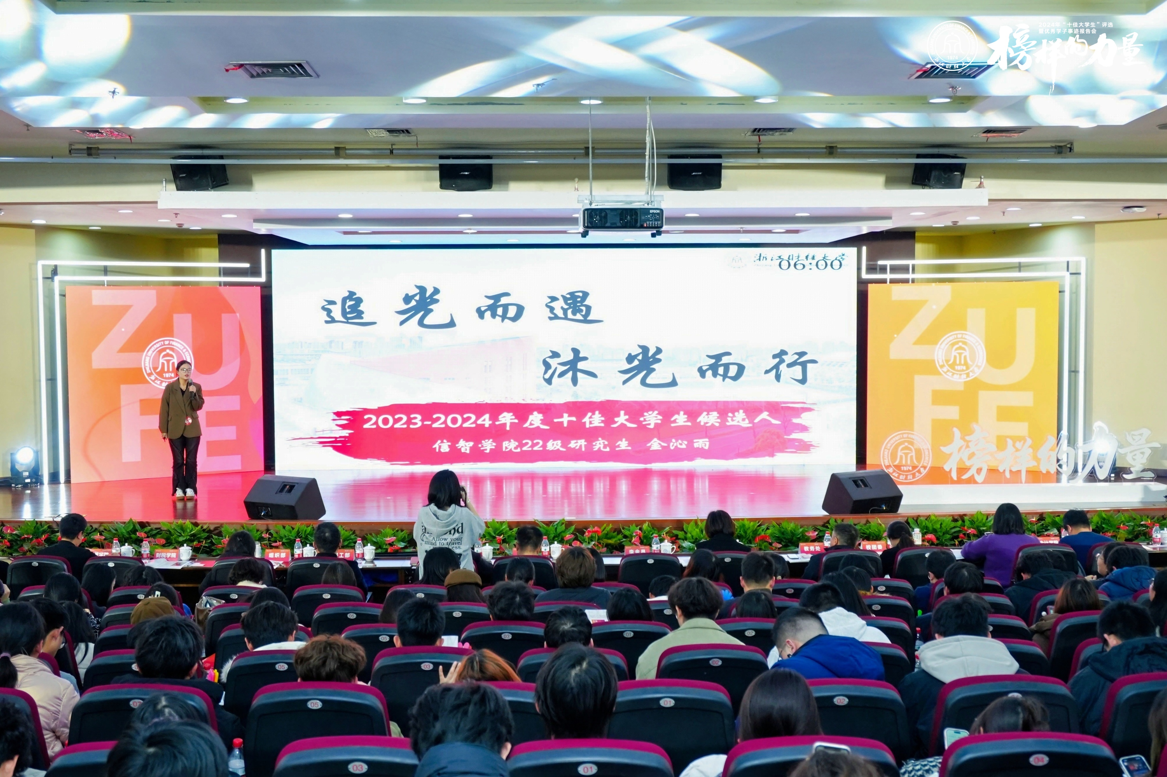 12月16日,2024年金年会jinnianhuicom“十佳大学生”评选暨优秀学子事迹报告会在学术第一报告厅圆满落下帷幕,金年会学子经过组织推荐和现场展示评选,凭借德智体美劳各方面的优秀表现以及在学术研究、学科竞赛、社会实践、志愿公益等领域的突出成果,经过激烈的角逐,在全校众多优秀学生中脱颖而出。2022级管理科学与工程专业硕士研究生金沁雨、2022级人工智能专业本科生江宇鑫同时获评校“十佳大学生”,展现了信智学子昂扬向上的精神风貌、踏实进取的优良学风,发挥了积极的榜样作用。