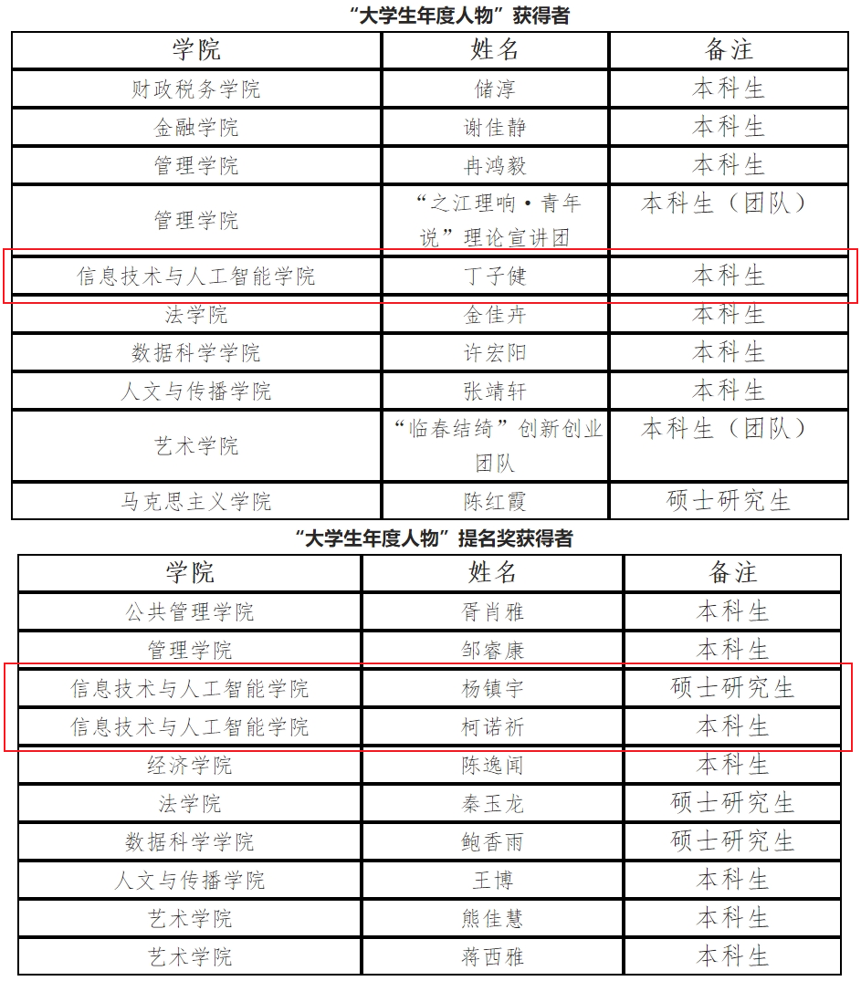 近日,金年会jinnianhuicom2024年“大学生年度人物”评选活动落下帷幕,全校本科生和研究生共有10个个人或团队获“大学生年度人物”荣誉称号,另有10个个人或团队获“大学生年度人物”提名奖荣誉称号。金年会本科生丁子健以德智体美劳各方面的优秀表现和丰富的学术成果在全校众多优秀学生中脱颖而出,获评“大学生年度人物”荣誉称号;硕士研究生杨镇宇、本科生柯诺祈获评“大学生年度人物”提名奖荣誉称号,展现了信智学子昂扬向上的精神风貌、踏实进取的优良学风,发挥了积极的榜样作用。